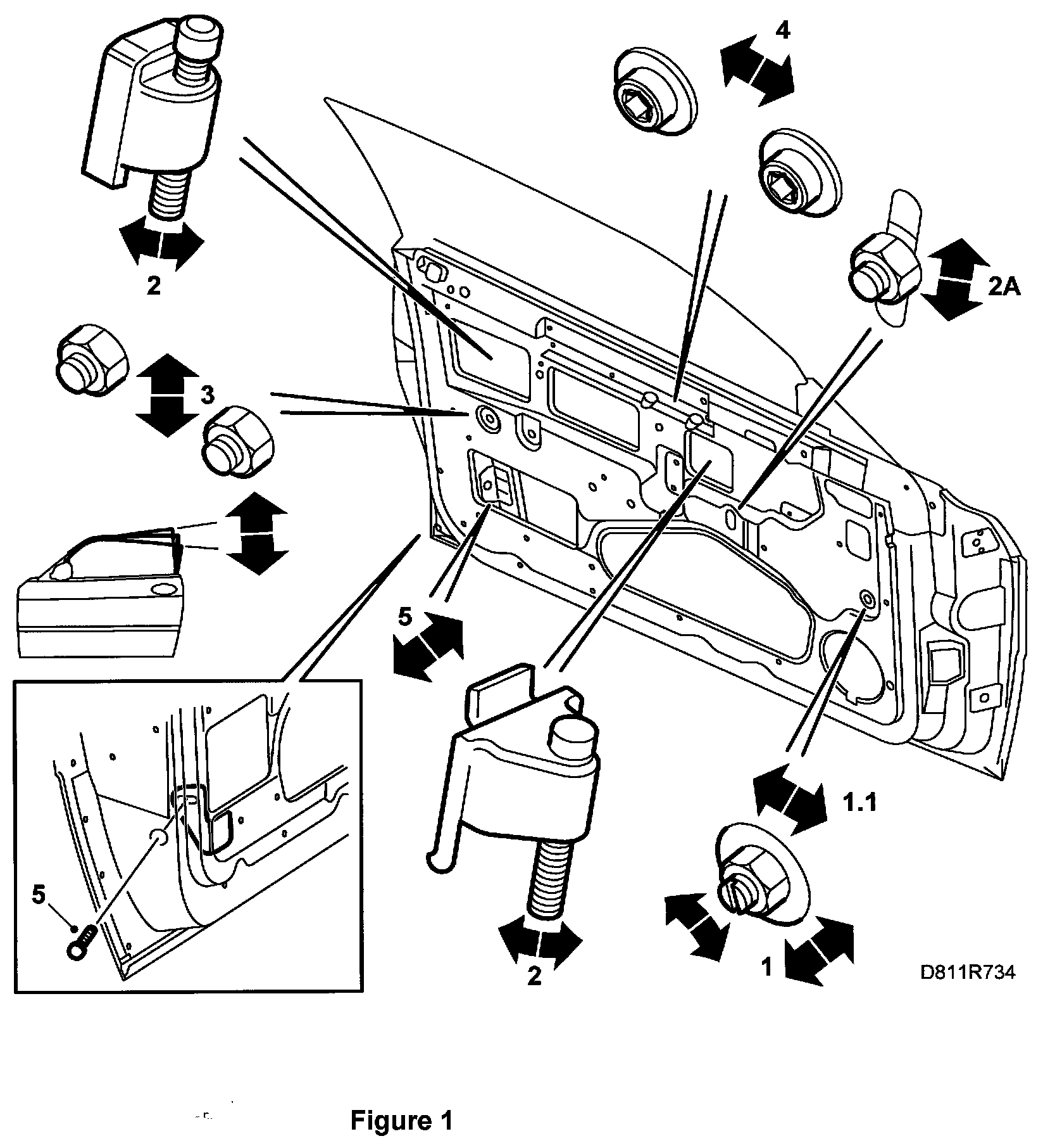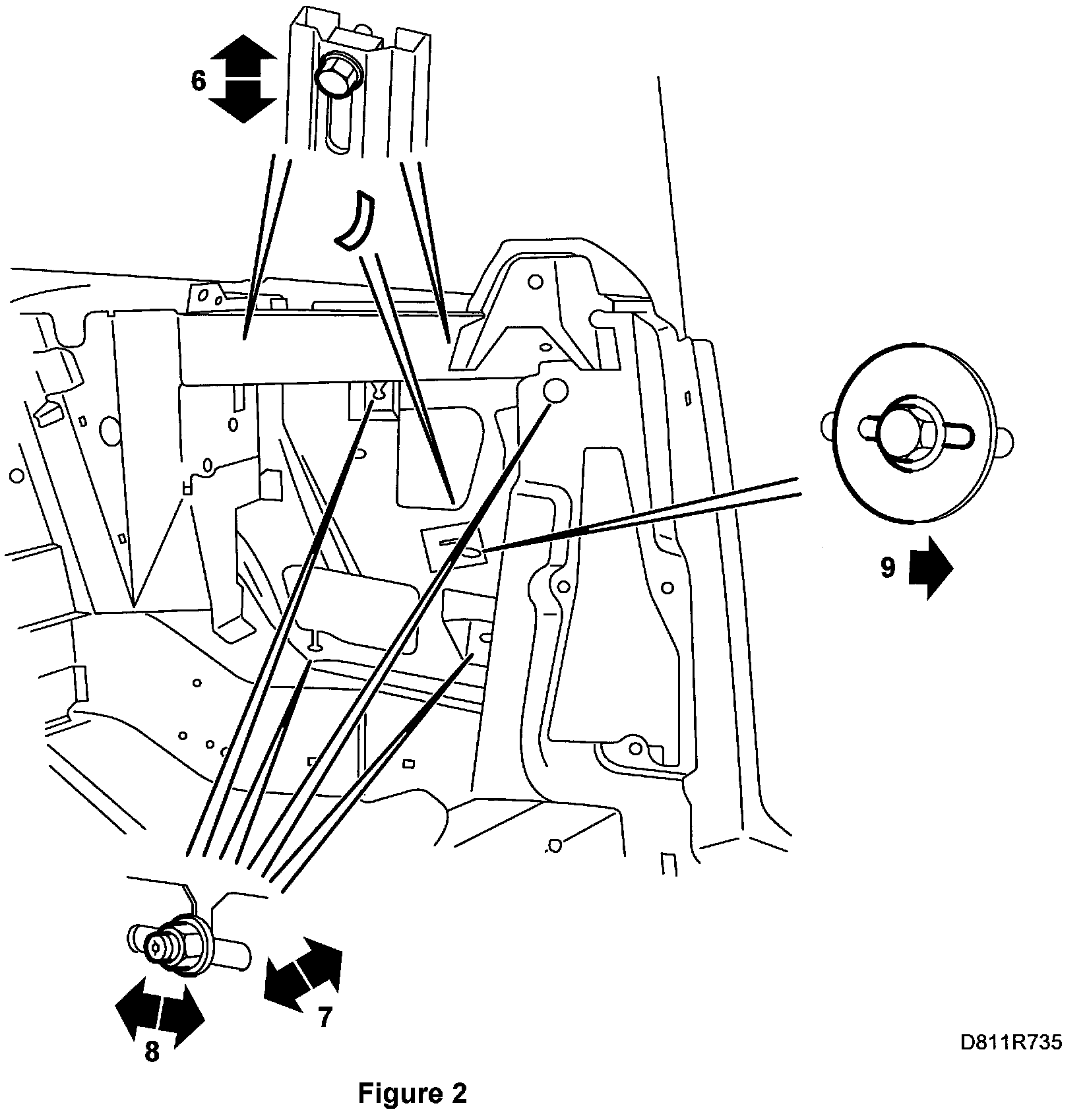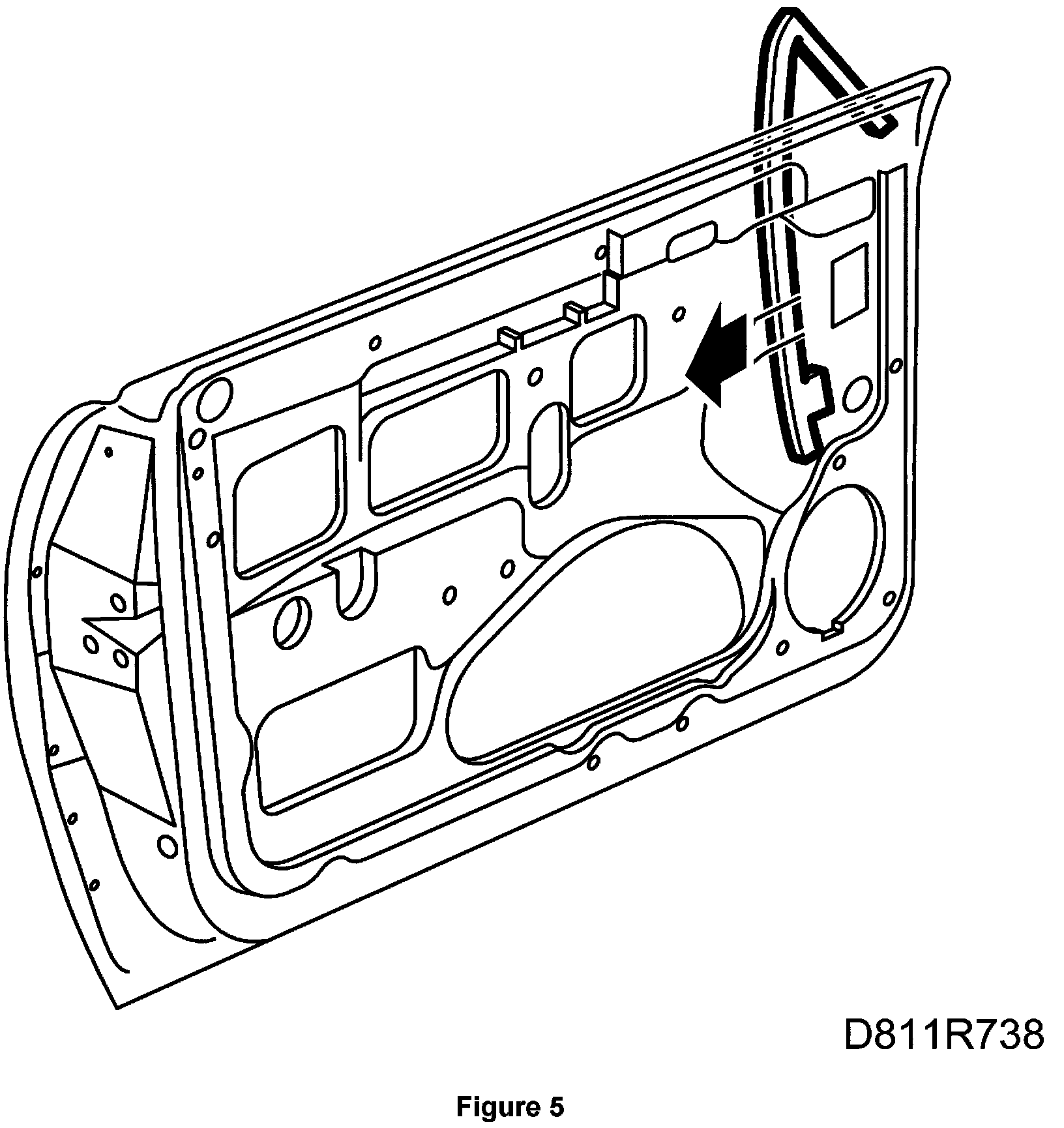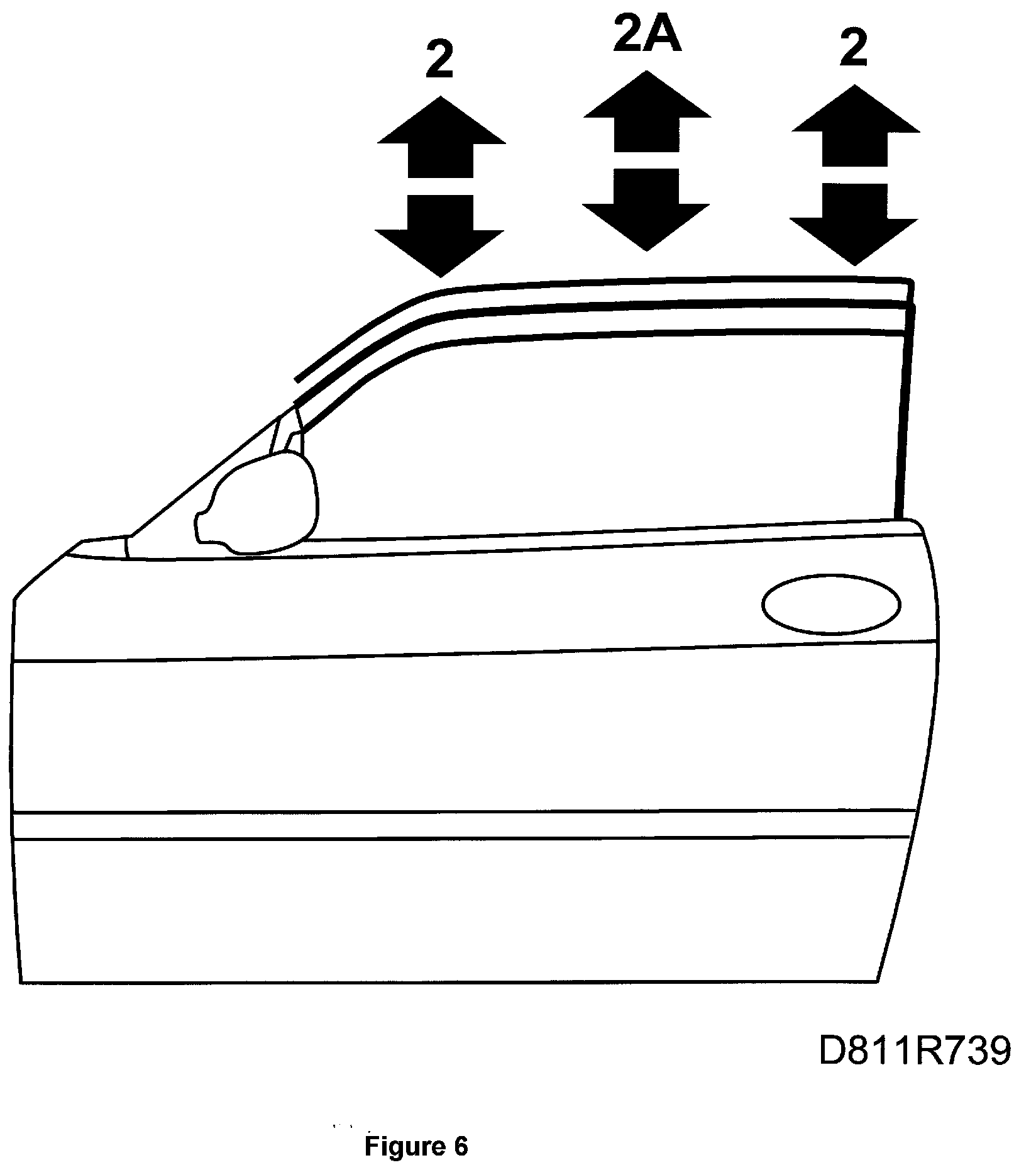 2. Check/adjust the longitudinal alignment of the front support rail. ADJUSTMENT 1.1 Alignment affects the support of the door window provided by the support rail.