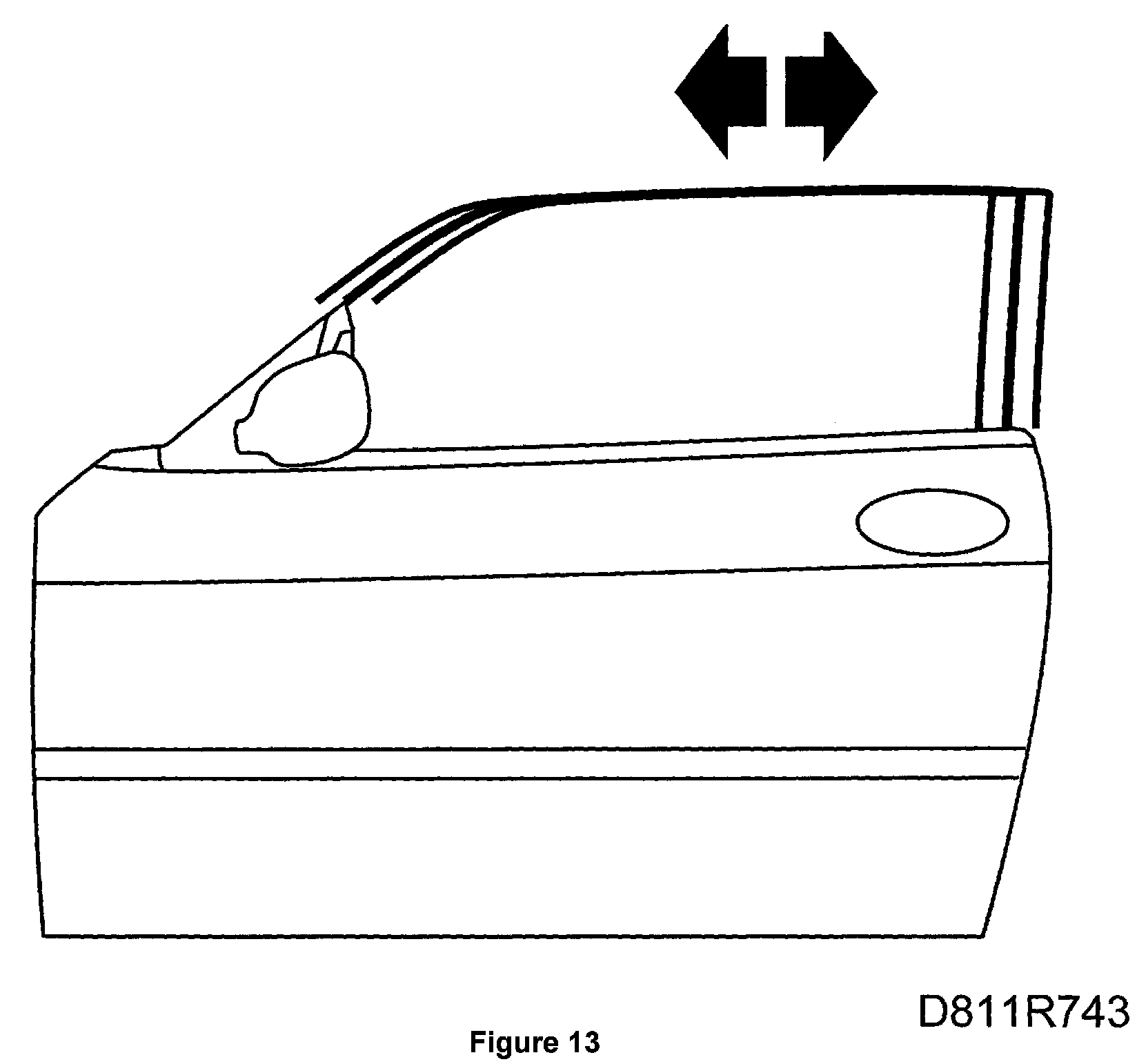 Lower the door window and raise the side window to the up position. Check that the door window and side window do not collide. The door window and side window should not cross.