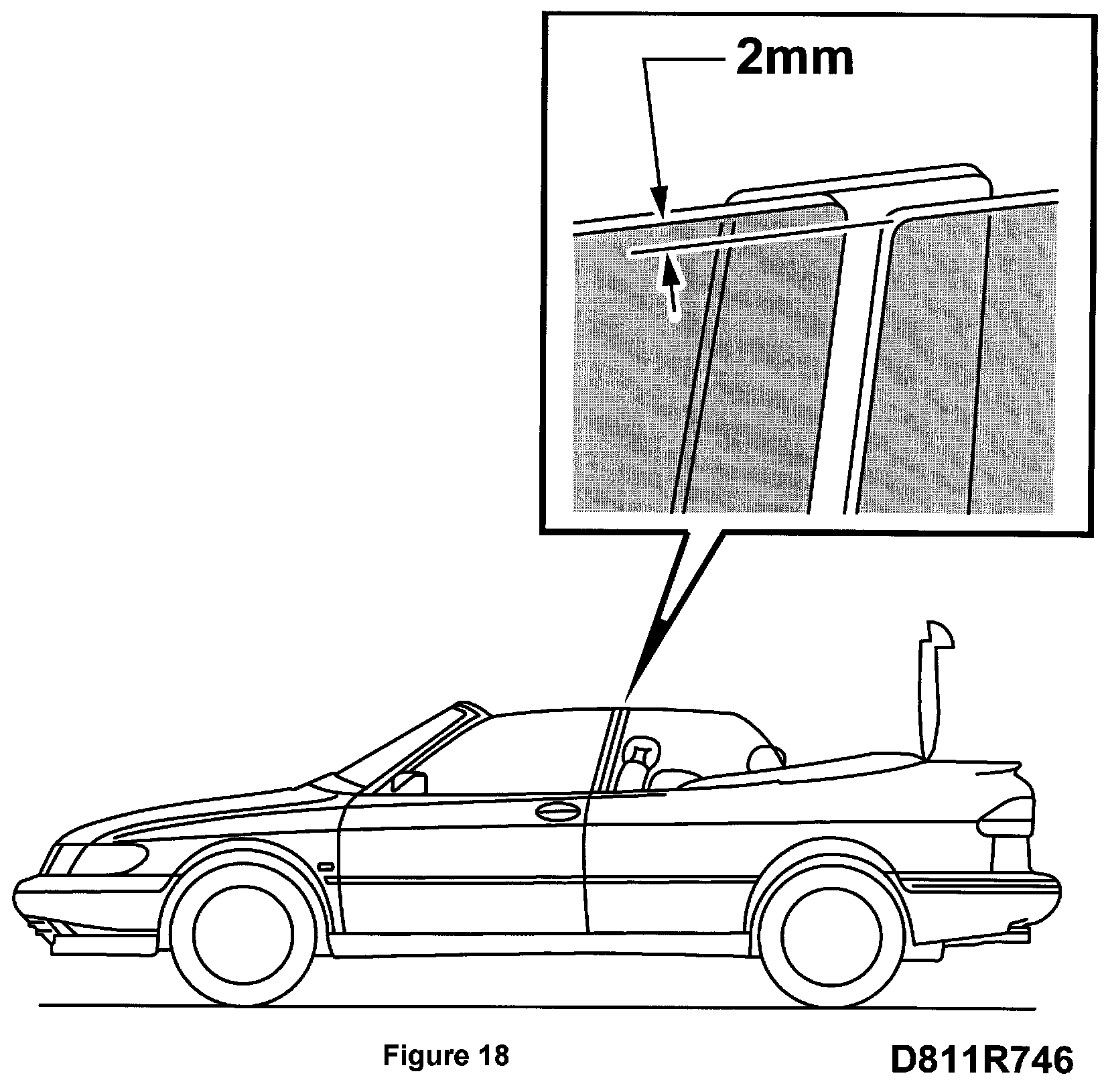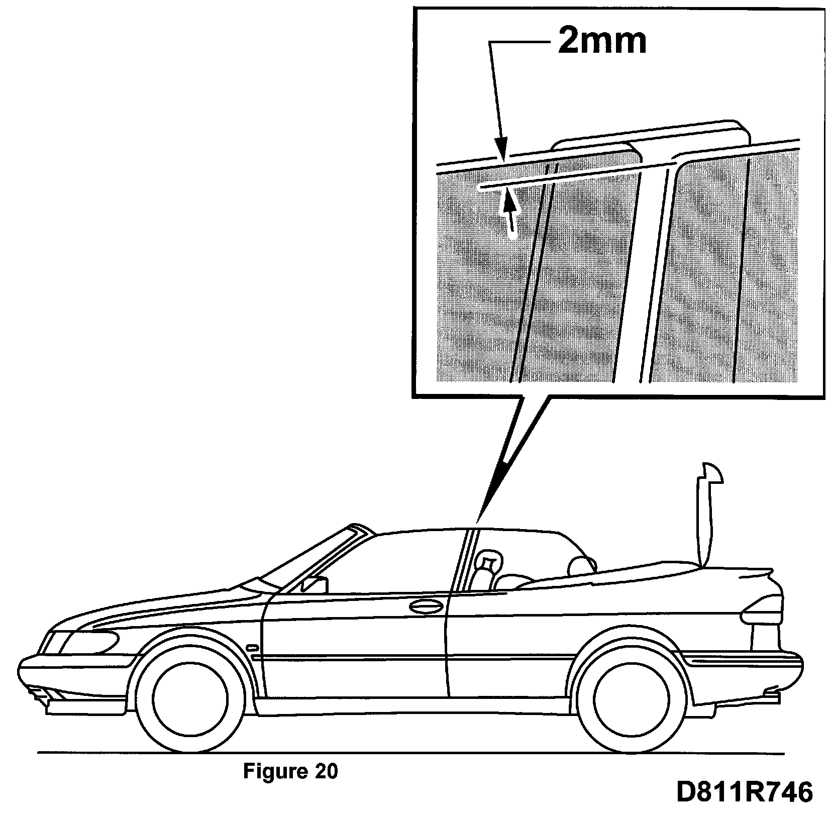 Adjust the height of the side window's upper edge so that it is 2 mm below the upper edge of the door window when both the door window and the side window are in the up position. Check the adjustment with an open soft top.