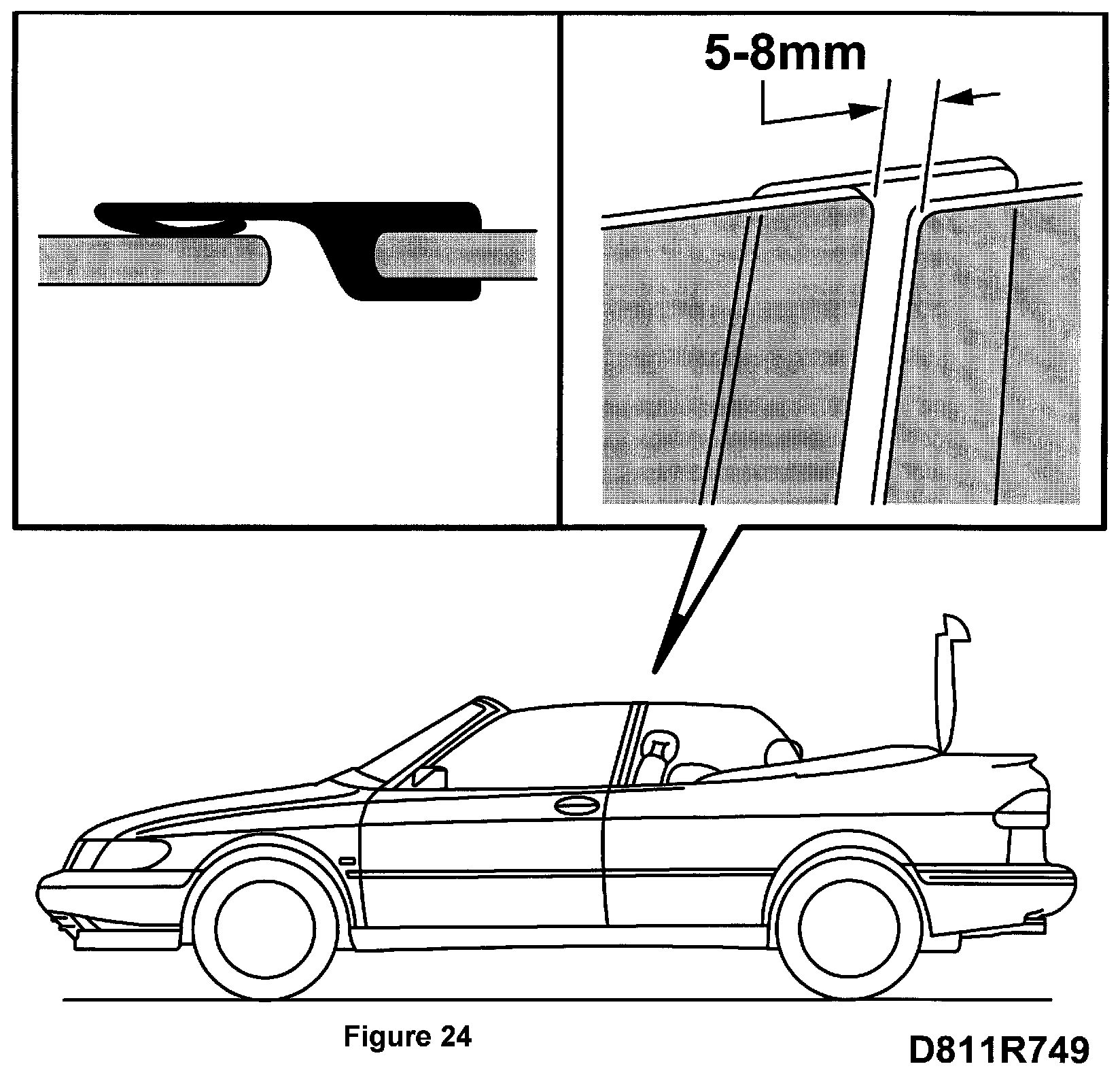 The distance between the door window's rear edge and the front edge of the side window seal must be equal and between 5-8 mm. Check the adjustment with an open soft top.
