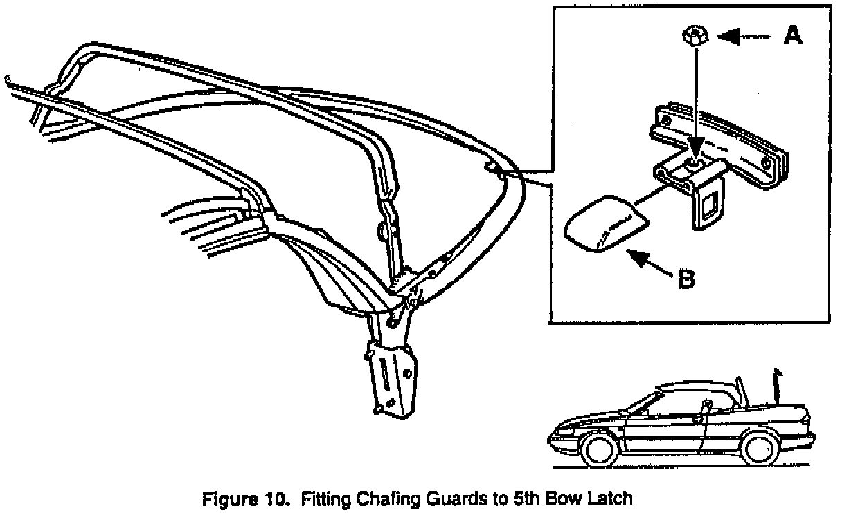 Fit chafing guards over the 5th bow's latch fittings to minimize the risk of wear on the top fabric when the top is down.