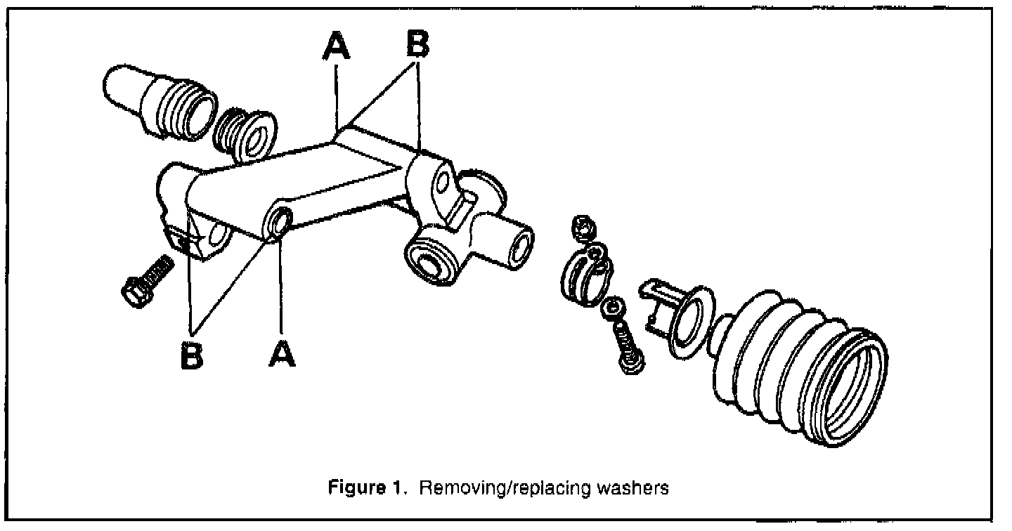 3. Remove the two 2 mm washers (Figure 1, item A) from the linkage and fit the four new ones (1 mm) as shown in Figure 1, item B.