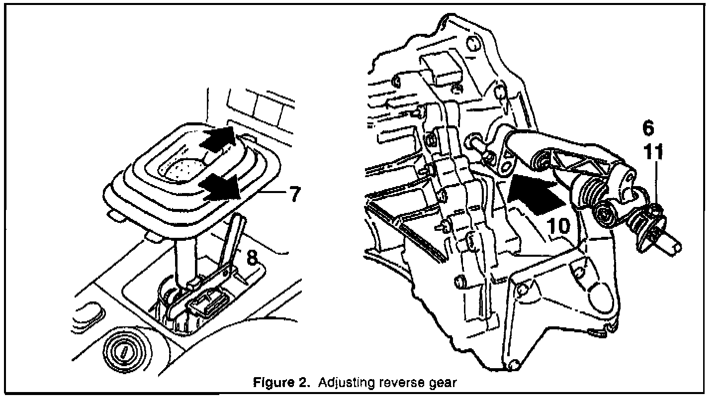 10. Press the entire gear linkage against the gearbox so that the reverse gear is positively engaged. Release the linkage. See Figure 2, item 10.