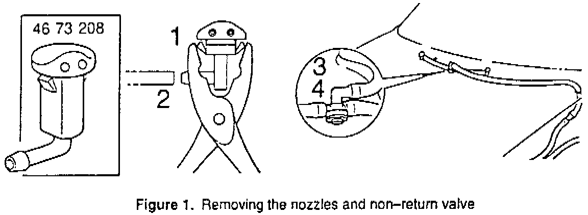 Both washer nozzles should be replaced and the non-return valve cleaned. If the non-return valve cannot be cleaned. replace it.
