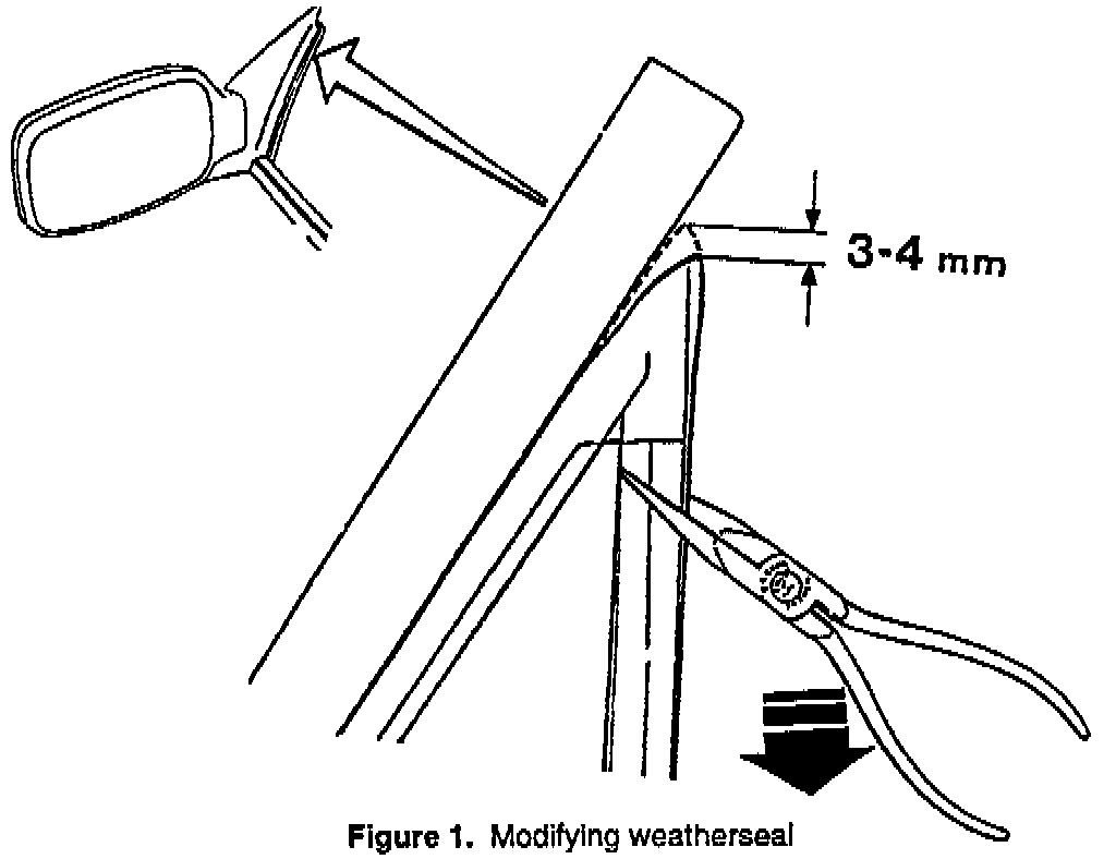3. Using a ruler or straight edge as a guide pull the vertical end of the weatherseal down until the tip is 34 mm lower than its previous position. See Figure 1.