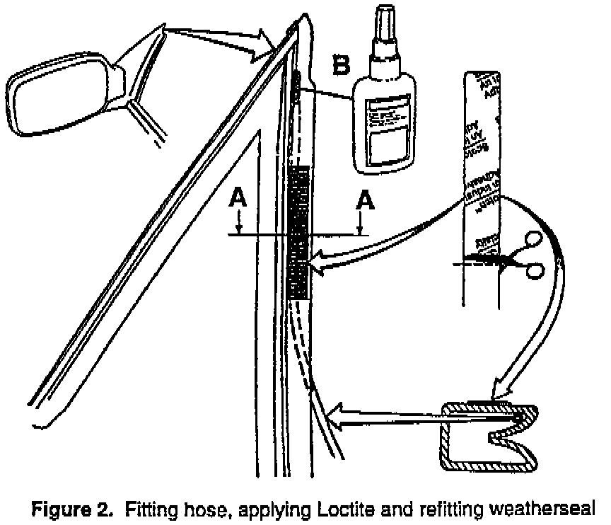 ^ Cut the hose to the same length (about 15 cm) as the vertical part of the weatherseal. See Figure 2.A.