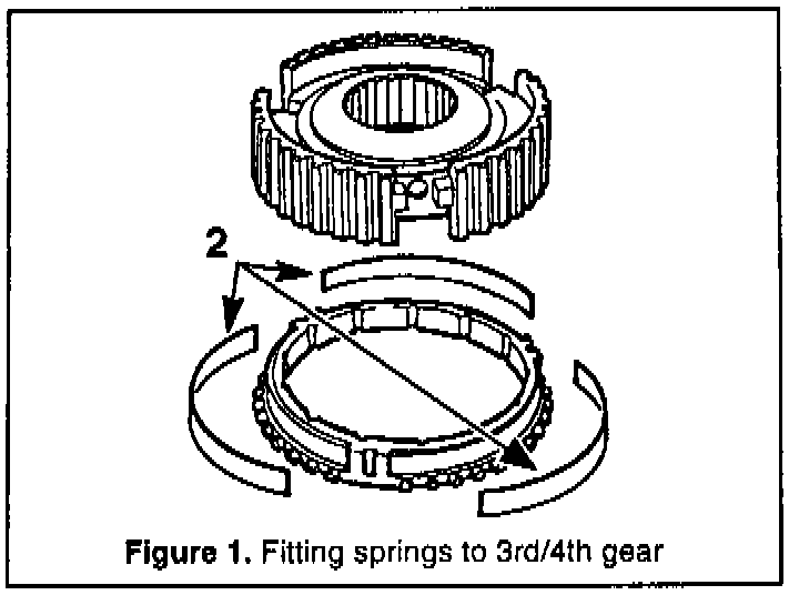 2. 3rd/4th Gear: Fit three leaf springs, P/N 87 43 791, between each of the two synchromesh sleeves and the hub (see item 2, Figure 1).