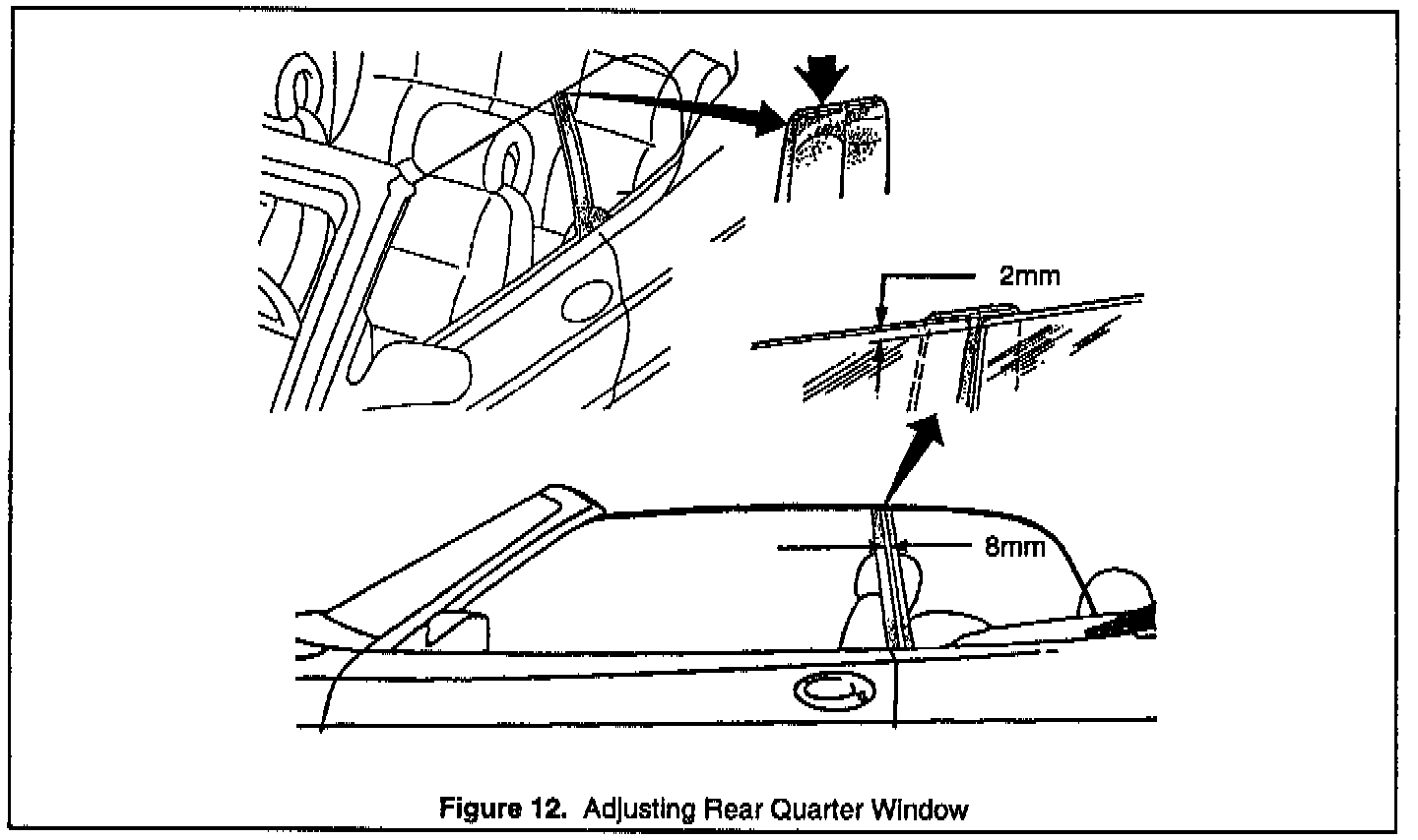 The clearance between the front side window and the leading edge of the rear quarter window should be 5/16" (8 mm) from top to bottom. See Figure 12.