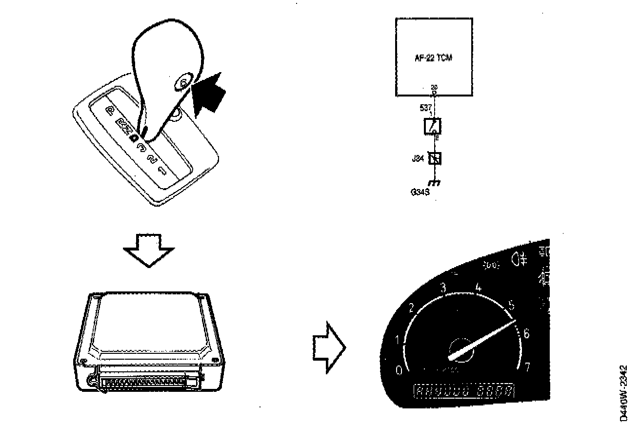 A fully depressed accelerator pedal activates the kick-down switch and gives 0 V (ground) on pin 8. The TCM uses the signal to select gear shifting points for maximum performance. The kick-down function is available in all gear shifting programs.