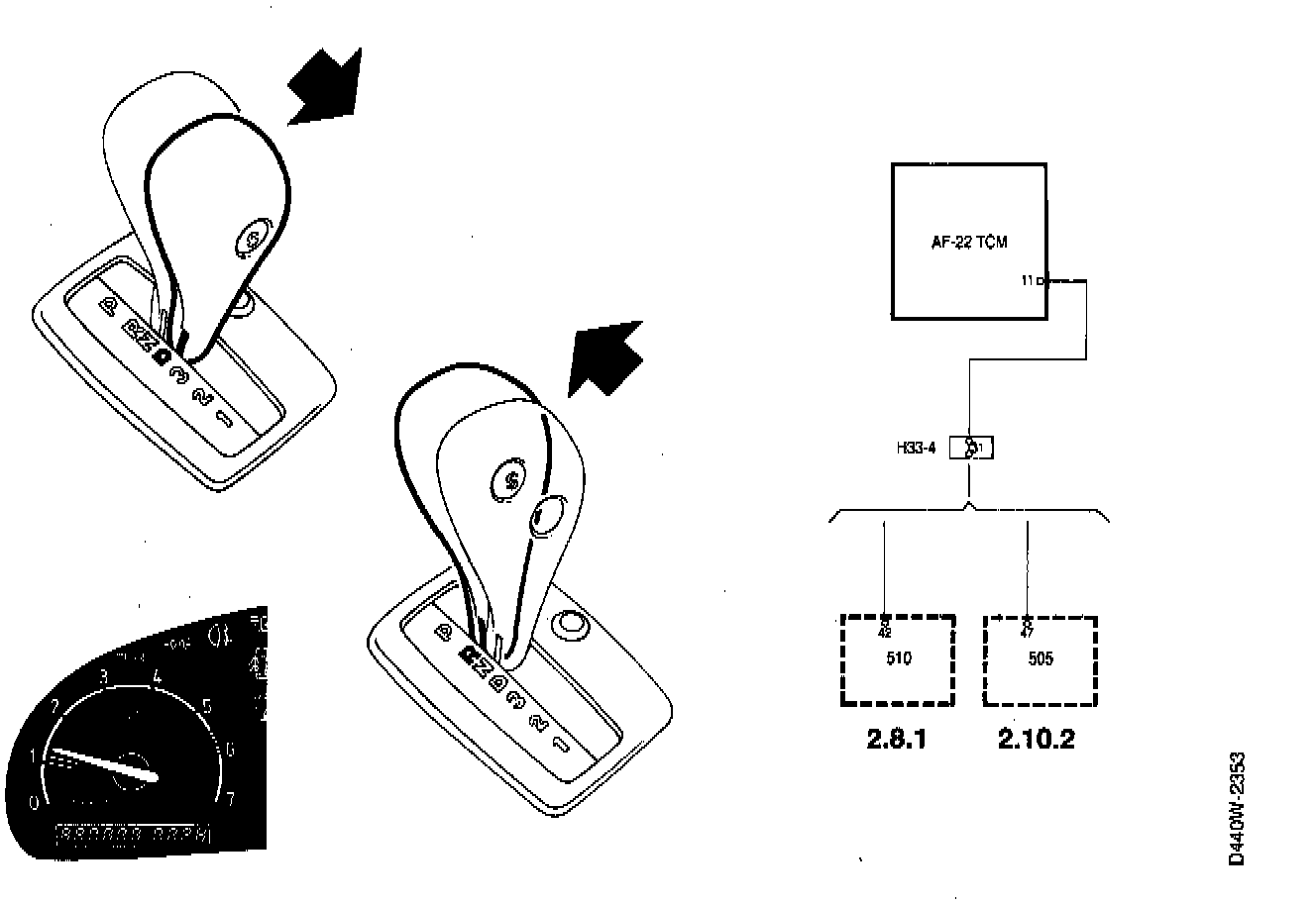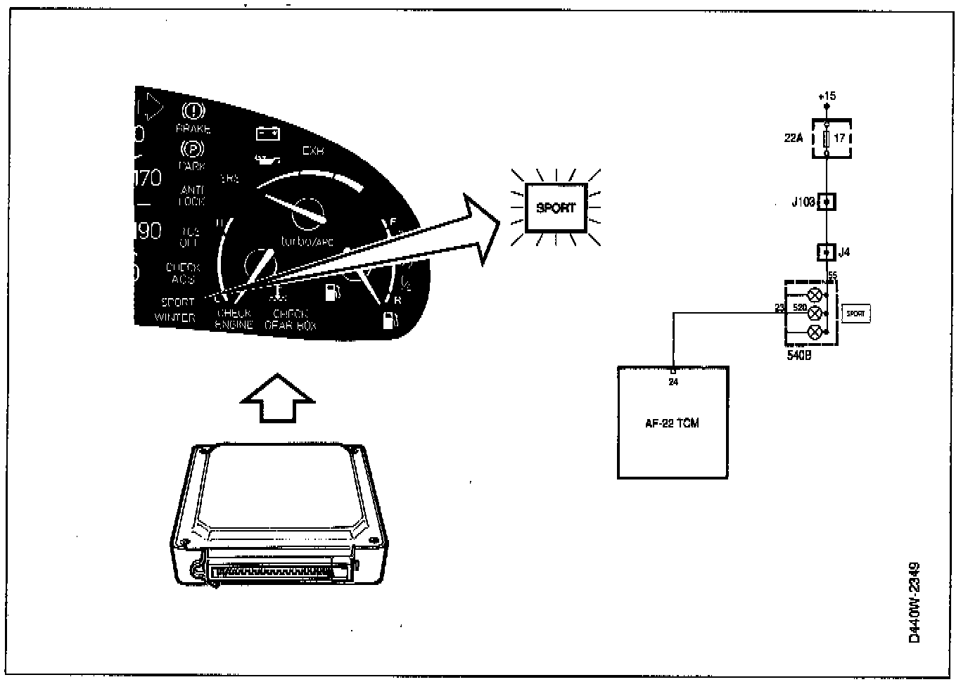 There is a spring-loaded switch in the knob of the selector lever with which it is possible to change between NORMAL and SPORT gear shifting programs. NORMAL is always connected from the start. The SPORT program means that the transmission stays longer than normal in each gear and that the gear shifting points are adapted to performance. The gear shifting points for light acceleration and full acceleration are, however, identical for NORMAL and SPORT. Activation Of the switch gives 0 V (ground) on pin 20 of the TCM.