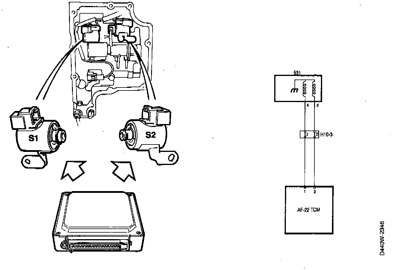 All solenoid valves are located in the shift solenoid assembly which is fitted to the transmission. Shift solenoid S1 and S2 control the shifting of gears. The solenoids are automatically grounded in the transmission during assembly and operate when they are activated via battery voltage. Solenoid S1 is powered via pin 1 and solenoid S2 via pin 3 in the TCM.