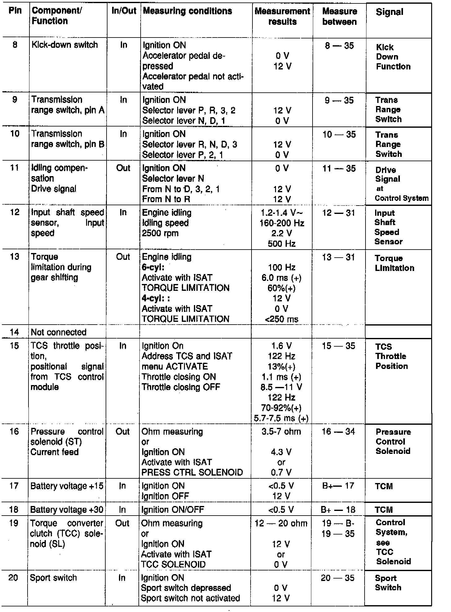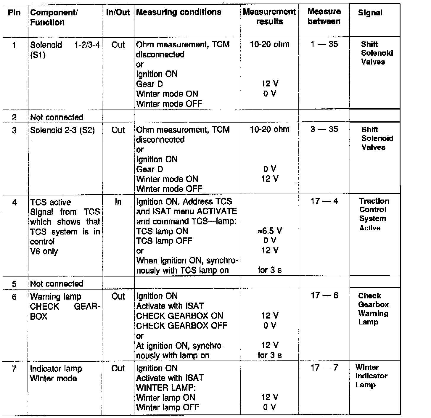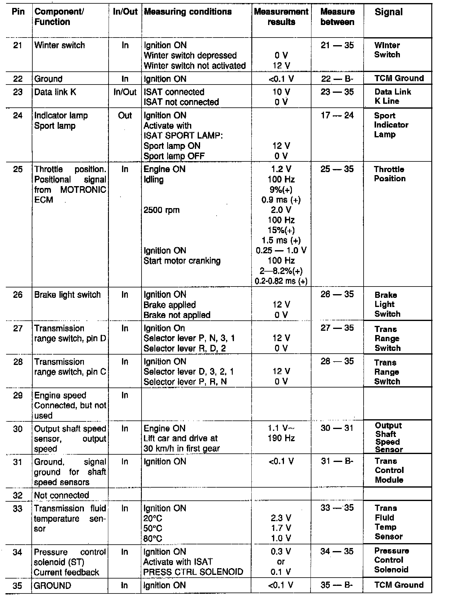 Remember when measuring:- Measurement result 12 V should be regarded as a voltage level, not as an absolute value. In, for example, solenoid 1-2/3-4 (S1) (pin 1), solenoid 2-3 (S2) (pin 3) and solenoid lock-up (SL) (pin 19), 0.7-1.5 V is (S2) lost internally in the Transmission Control Module (TCM). Measuring between these pins and ground (pin 35) thus shows that the battery voltage has fallen by 0.7-1.5 V which is stated in the table below.