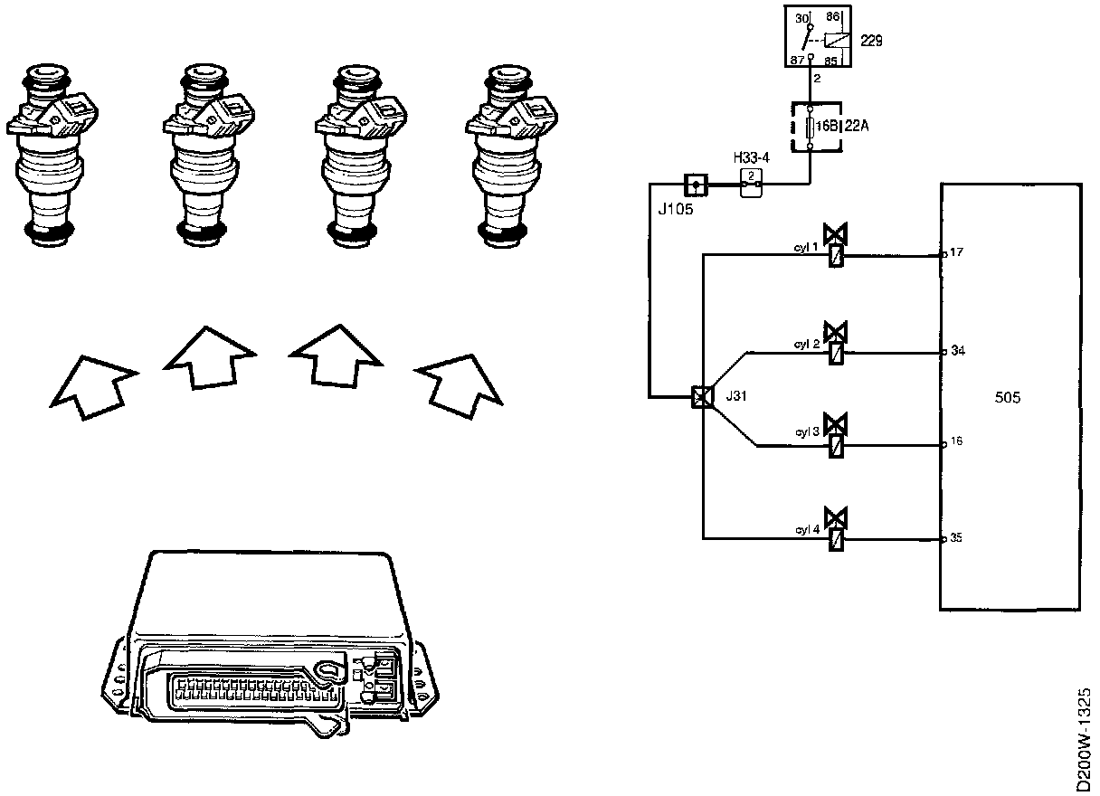 On the basis of the control module's input signals from the oxygen sensor, mass air flow sensor, crankshaft position sensor and other sensors, the exact amount of fuel to be injected into the cylinder is calculated. This is done by varying the length of the grounding signals between 3 and 15 ms. In conditions of extreme cold, i.e. below -3O°C (- 22°F) signal duration may increase to 22O ms. The system has no cold-starting valve.