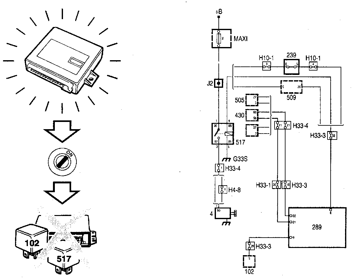 - The starter relay (ignition "ST" + 50) receives no operating voltage as + 50 is fed to the alarm control module (pin 20) which breaks operating voltage on pin 8 if an attempt is made to start the car.