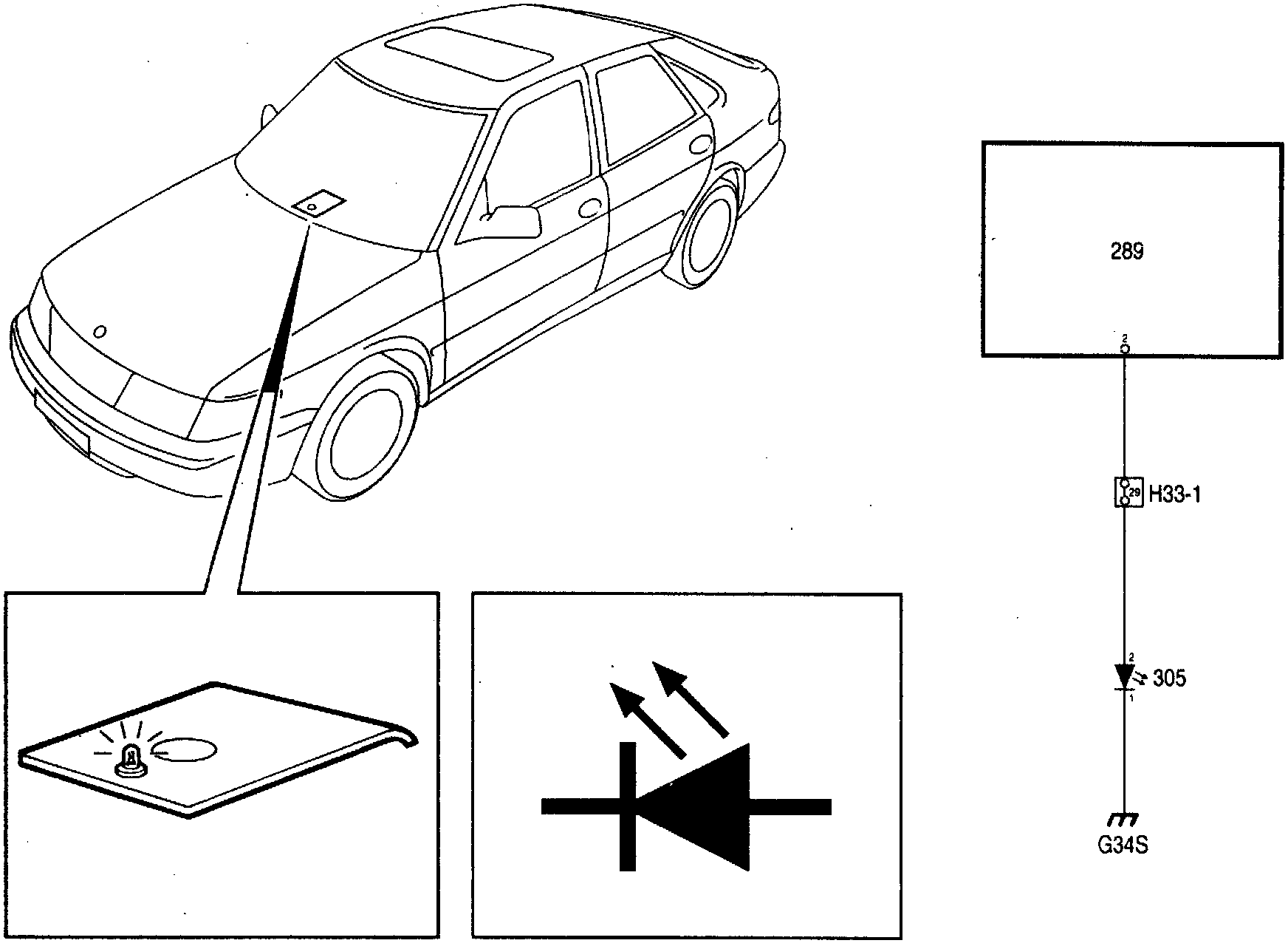 As a test function for the theft alarm, there is an LED mounted in the facia. This is controlled by the control module (pin 2) and flashes (with varying frequency) or lights continuously depending on the different conditions. Some normal cases are shown on the table.
