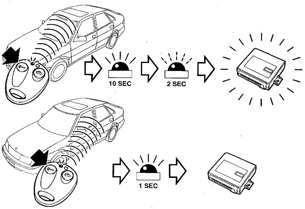 1 When arming press the left-hand button on the remote control. When the button is pressed, a light confirmation is given by the car's direction indicators flashing once. The flash/light confirmation for this function is programmable.