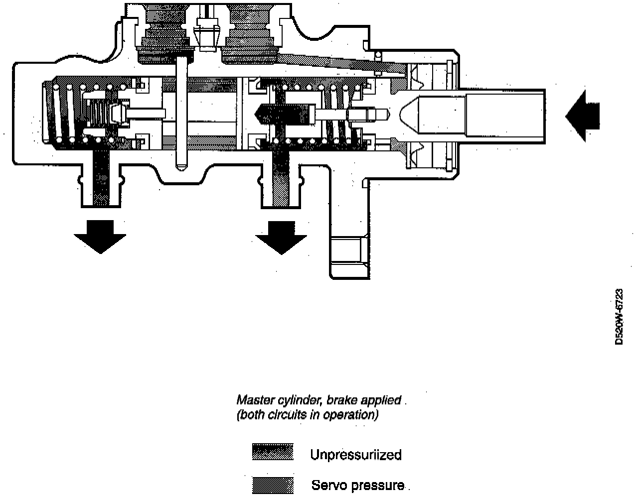 If there is a leak in the secondary circuit the secondary piston is pushed forwards and will touch bottom in the master cylinder. In both cases a longer pedal movement is required to accomplish the desired braking action.