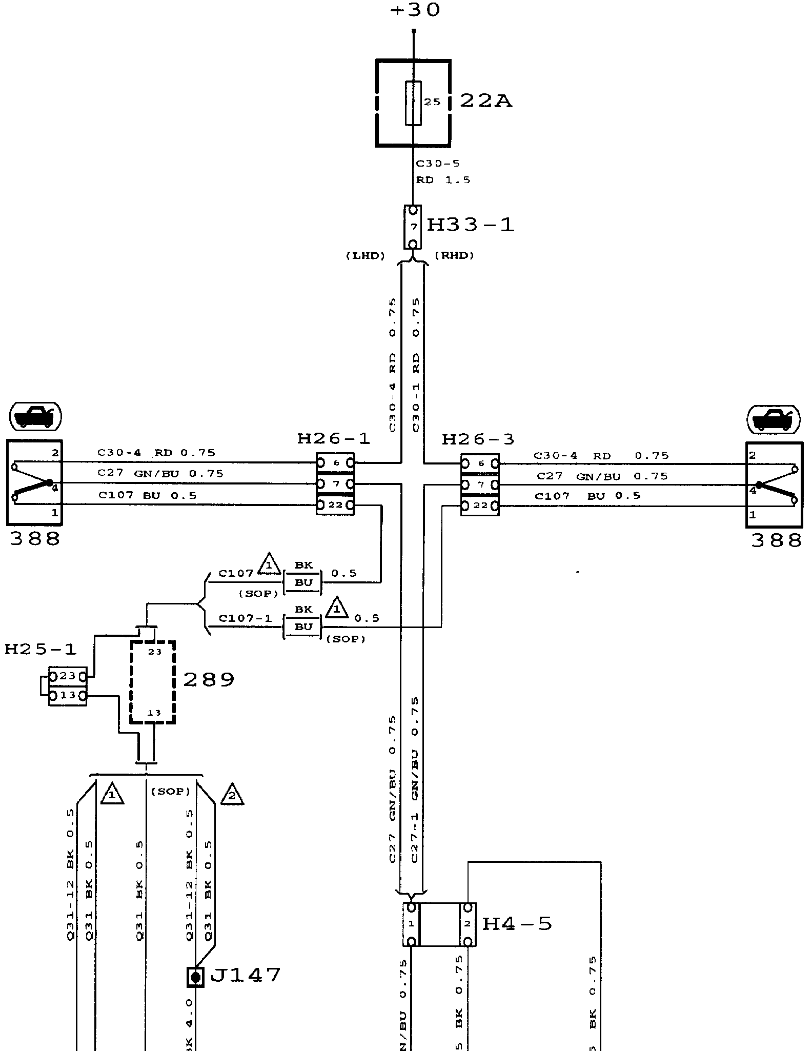 The tailgate can be opened either by means of switch 388 on the driver's door or by using the key. When the tailgate is opened by means of switch 388, motor 188 is supplied with current (+30 circuit) from the switch via fuse 25.
