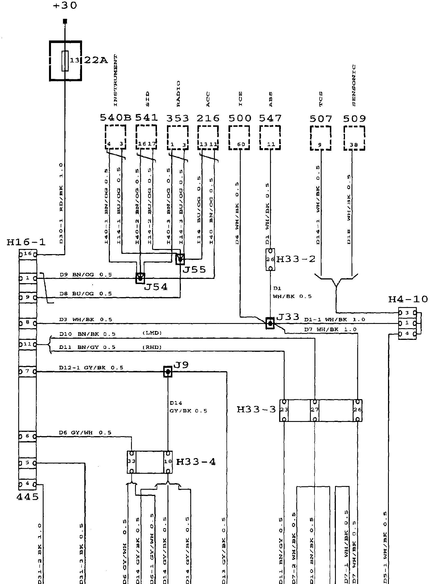 Current is supplied to the data link connector via fuse 13. The connector has power ground on pin 4 and signal ground on pin 5.
