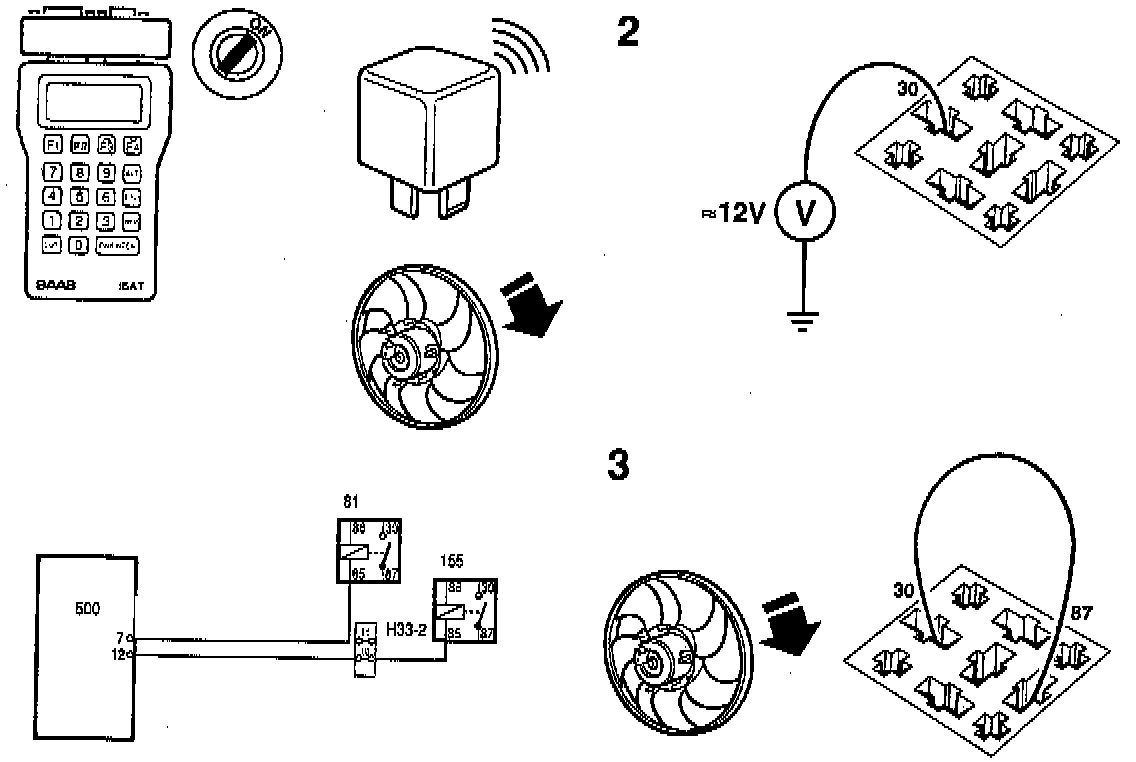 - If the radiator fan does not work, check that there is 12 V on connection 30 on the relay holder for each radiator fan relay.