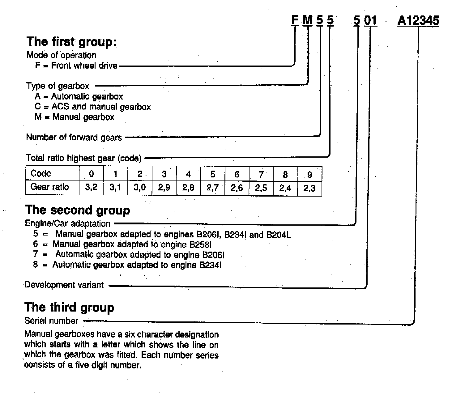 Manual gearboxes have a six character designation which starts with a letter which shows the line on which the gearbox was installed. Each number series consists of a five digit number.