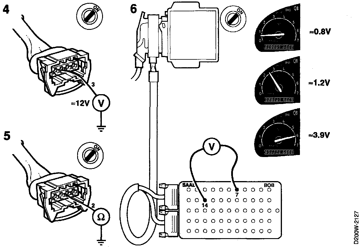 The above voltages may vary somewhat, depending on engine temperature, current consumption, etc. Should the mass air flow sensor be defective, the differences in the readings obtained will probably be fairly wide. In such case, change the mass air flow sensor.