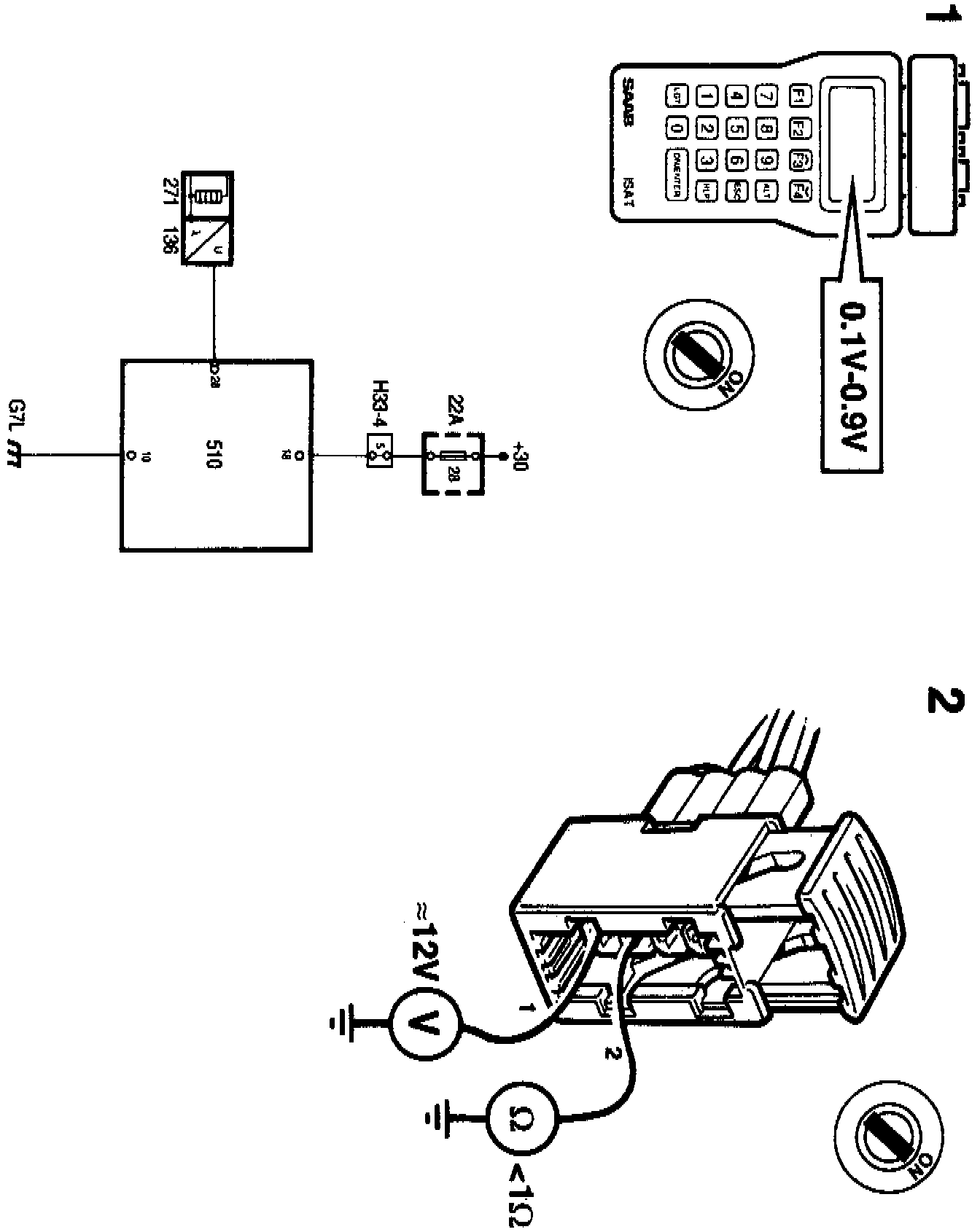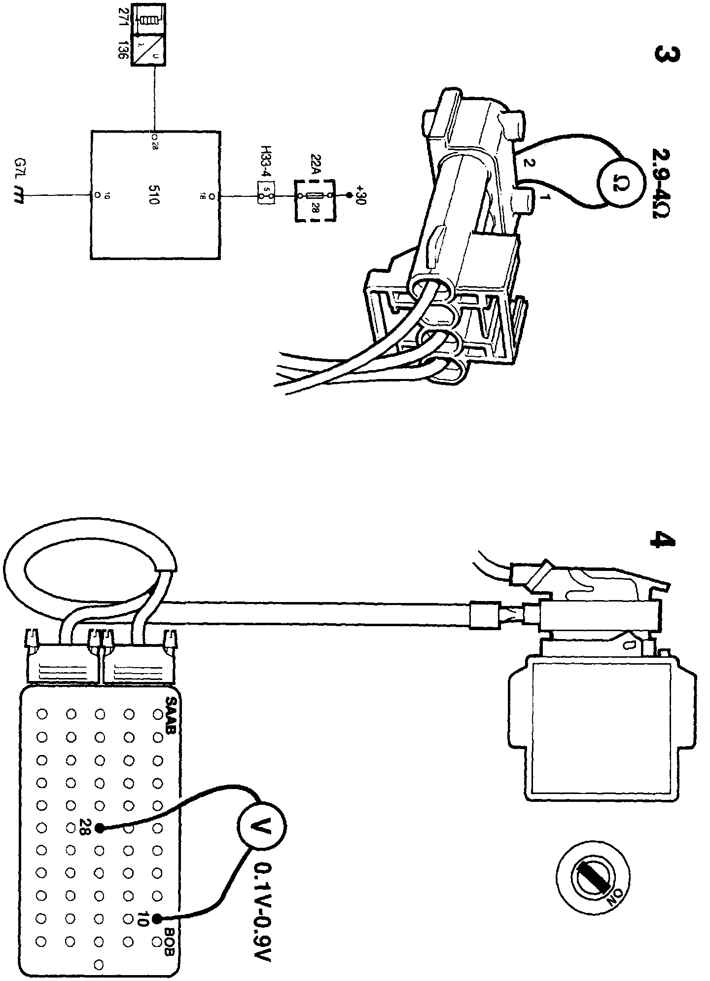 2. Unplug the rear oxygen sensor's connector and take a reading on pin 1 of the signal lead connector to check whether the preheater element receives current from fuse 38. Also check whether pin 2 is properly grounded at grounding point G7P.