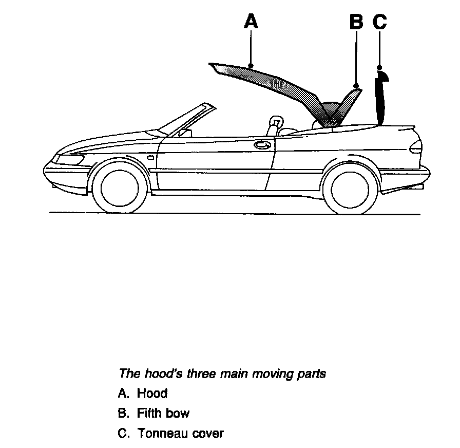 The hood system consists of three main moving parts: the hood (A), the fifth bow (B) and the tonneau cover (C). The maximum movement of each of these three parts is limited mechanically. Some of the mechanical end positions can be adjusted within certain limits. For instance, the end position of the hood when raised can be adjusted by means of a mechanical stop situated where the hood mechanism is attached to the car body.