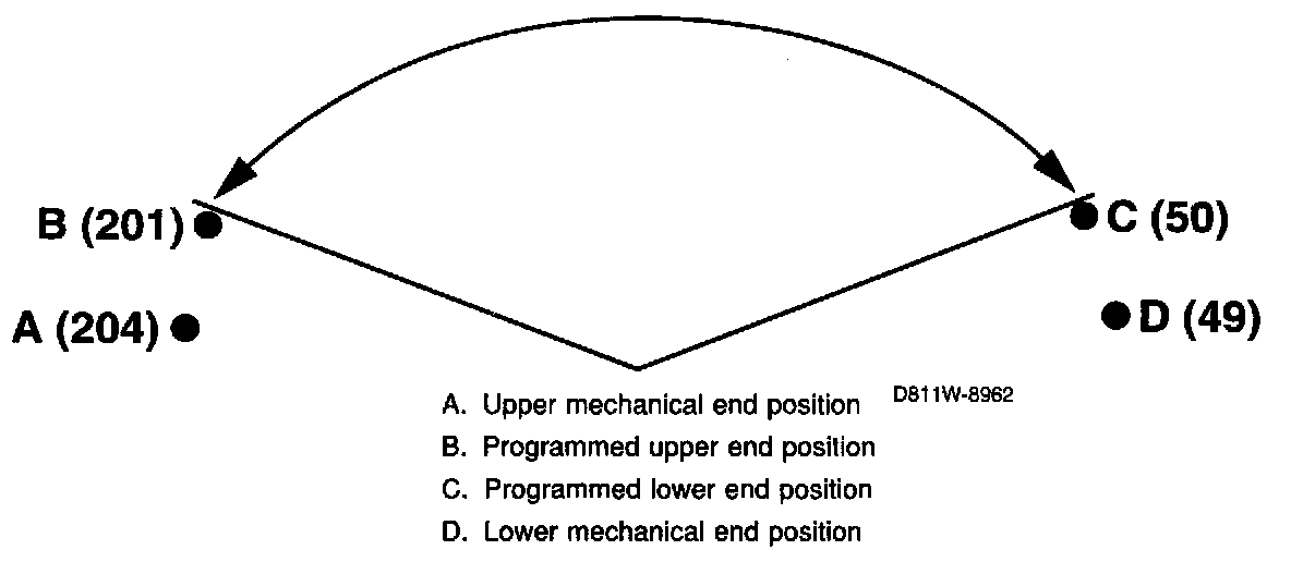 For lowering (opening) the hood, 1 unit should instead be added to the value signaled by the potentiometer when the hood has reached the lower mechanical end position. If the lower end position corresponds to a potentiometer value of 49, the control module should be programmed with the value 50. When the hood is lowered (opened) the control module will then count down from potentiometer value 201 (programmed upper end position) to 50. At this point the control module will stop operating the main motors driving the hood and the hood can descend to the mechanical end position (potentiometer value 49) by its own weight. In the ISAT Scan Tool the upper end positions are called "HIGH LIMIT" and the lower end positions are called "LOW LIMIT".