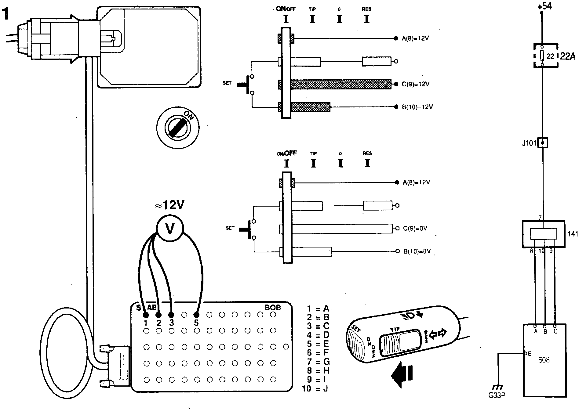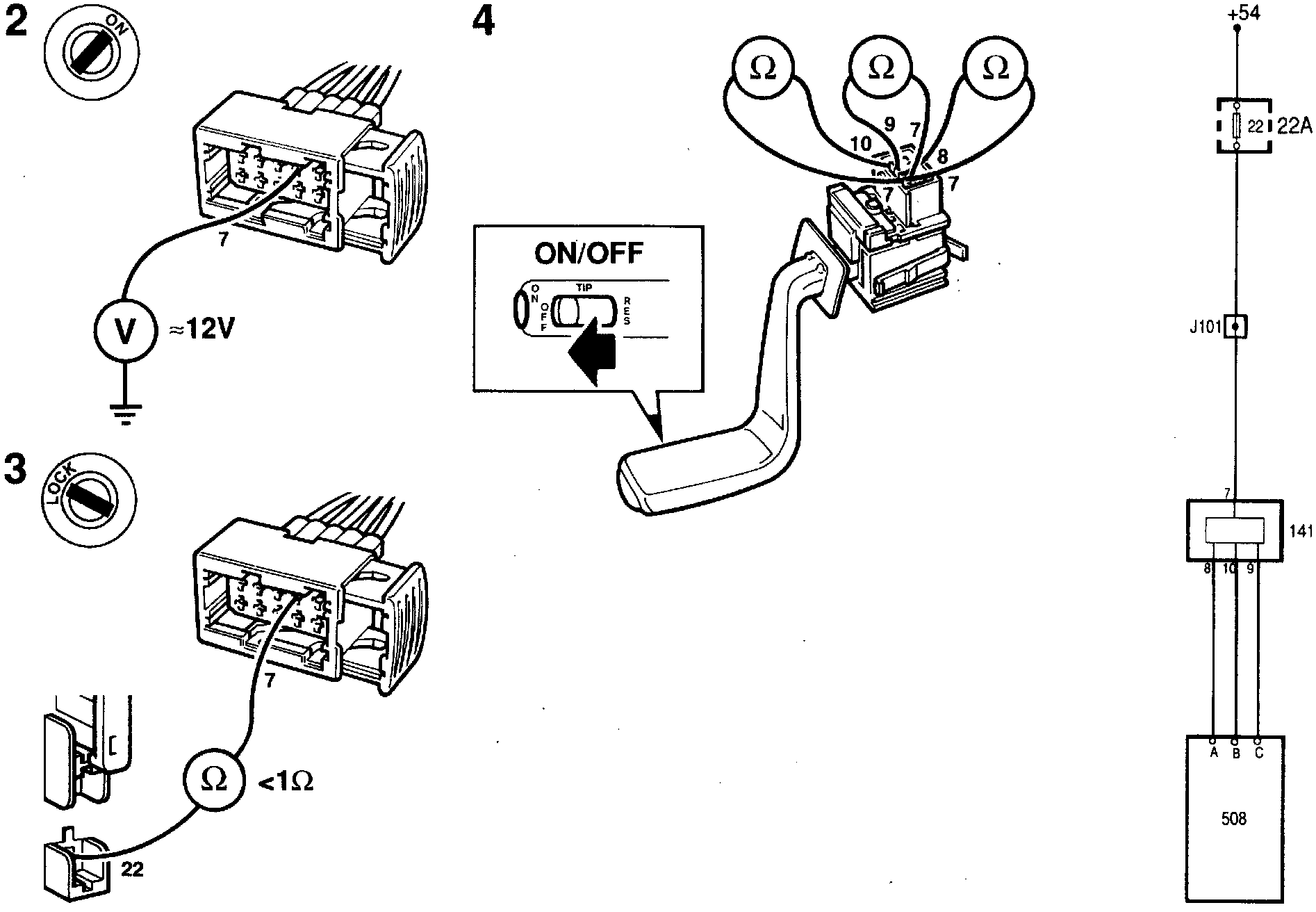 1 Connect the BOB and check that a supply of approx. 12 V is present on pins A (1), B (2) and C (3) of the Cruise Control connector when ON/ OFF is held in the depressed position.