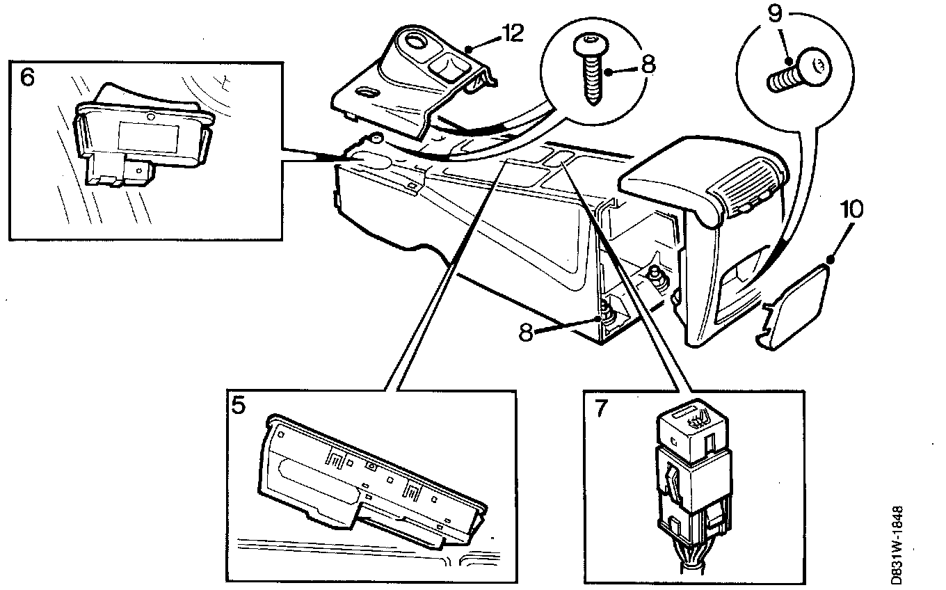 10. Free the interior lighting switch using a screwdriver or by pushing it up from underneath (the switch is held with clips) and pull it right up. Unplug the switch connector.