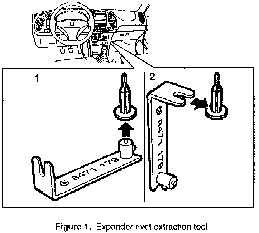 A new tool has been developed to assist in the removal of expander rivets. It can also be used to remove other types of plastic clips that have large heads. See below for instructions on using this tool.