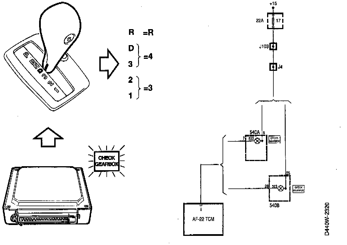 When the selector lever is moved to 1, 2, 3 or D from P, R or N, or to R from other positions, the TCM sends a signal to the engine control module which lowers the ignition and thus reduces the engine's torque to reduce any jerks when shifting gear.
