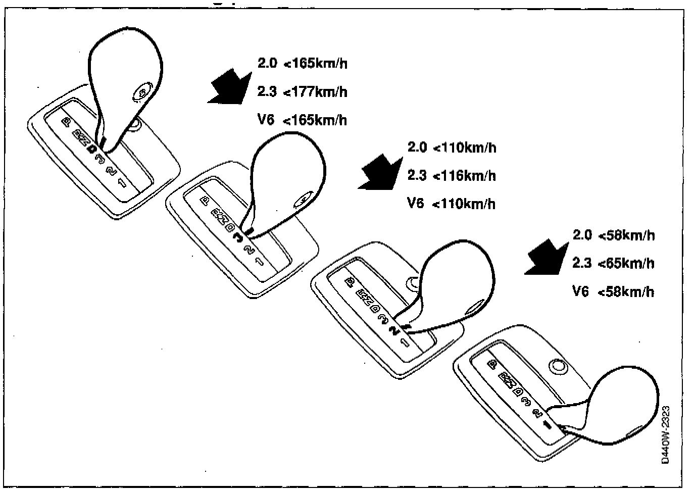 To prevent the engine from over-revving, the transmission is fitted with an over-revving protector. This means that it is not possible to shift to a lower gear until the speed of the car is below the limit value for the gear in question.