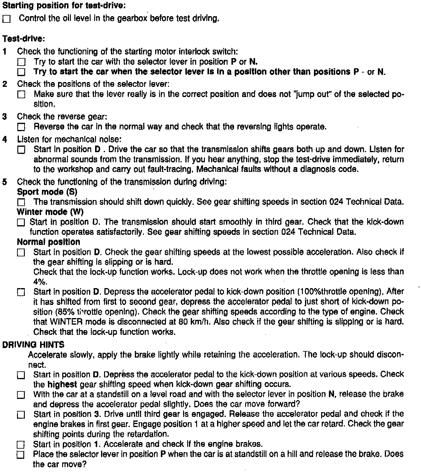 This schedule is intended for guidance during a road test to check complaints about automatic transmission AF 20/22. Note that the speed limits in force must not be exceeded.