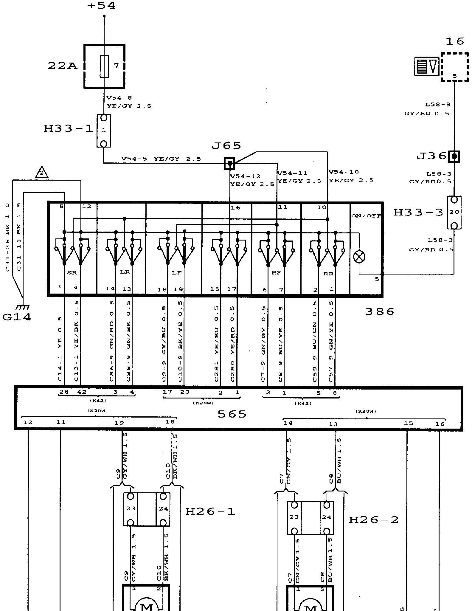 ^ Switch 386 for operating the window lifts in the front doors is supplied with current via fuse 14.