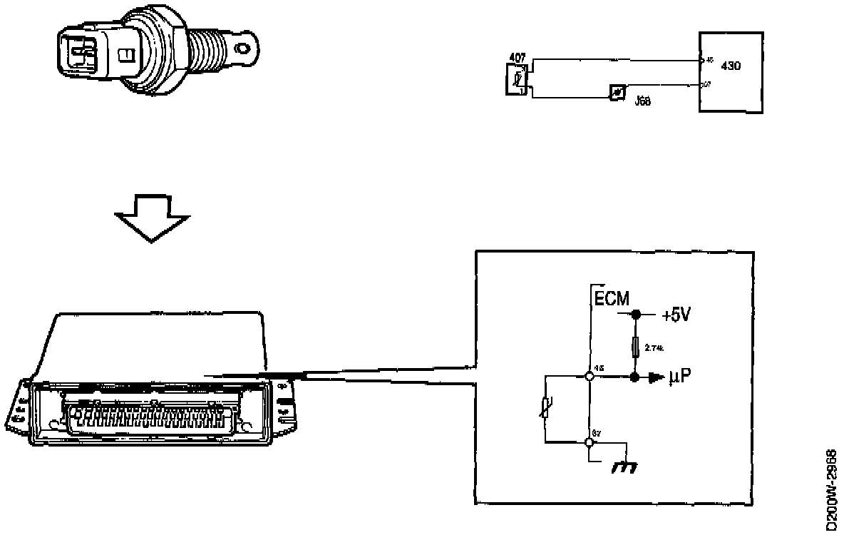 If the sensor does not work or if there is an open circuit, the ECM sets a substitute temperature of 8°C and the malfunction indicator lamp in the main instrument lights up.