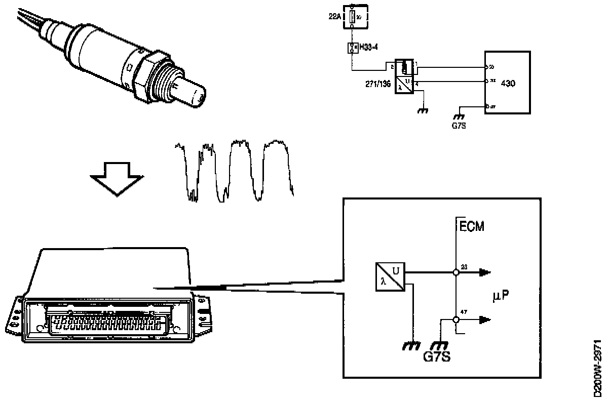 The ECM receives the voltage from the oxygen sensor on pin 23. This voltage is used to correct fuel injection times continuously so that lambda = 1.0 is always maintained. This is important for optimum operation of the three-way catalytic converter.