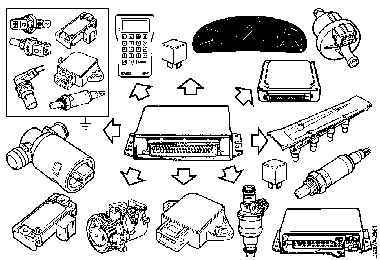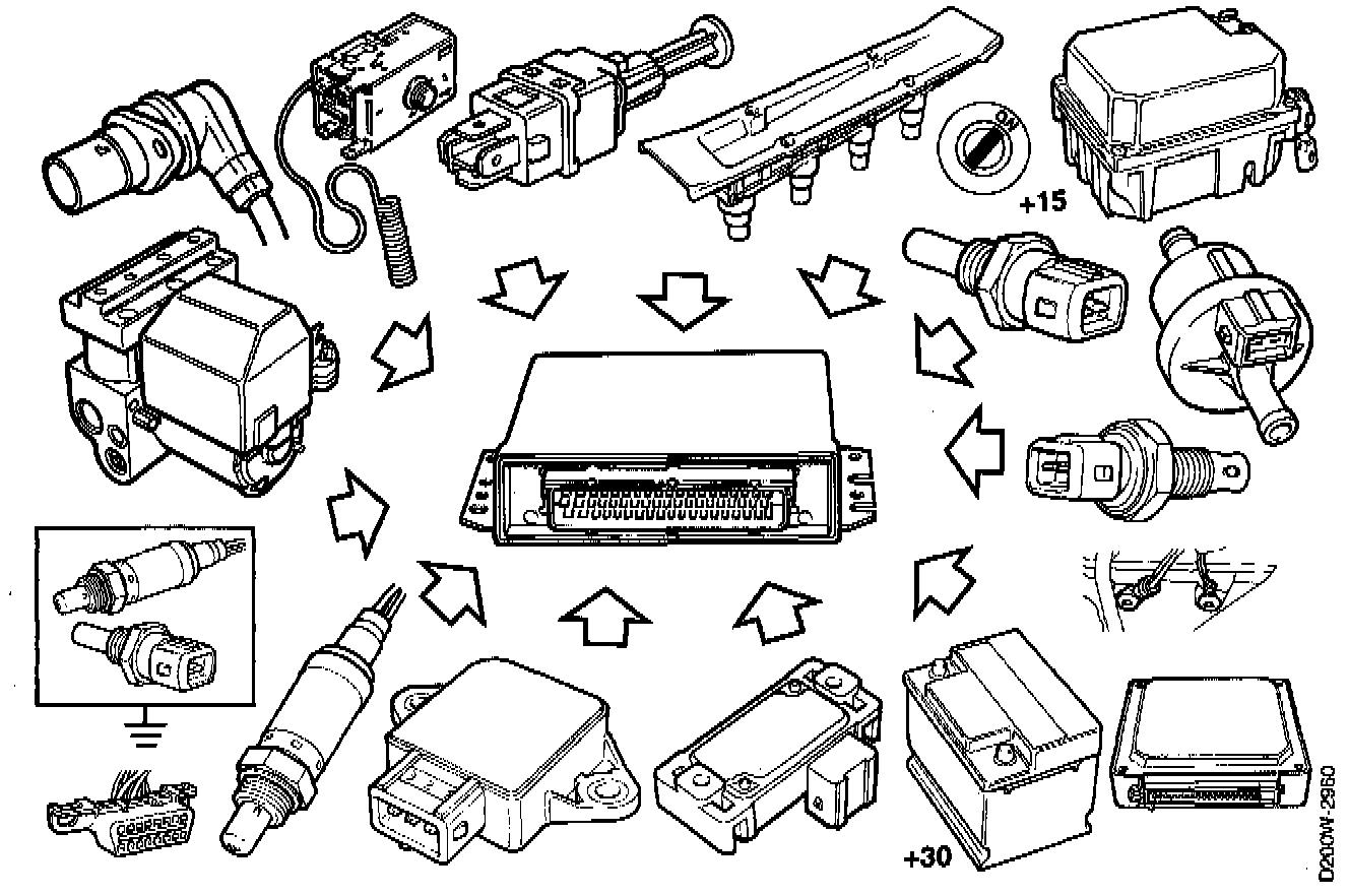 A number of sensors supply information to the ECM, which processes these using matrices which have been stored in the ECM after engine operation has been optimized. Examples of such important matrices are ignition timing matrices, fuel matrices and boost pressure matrices.