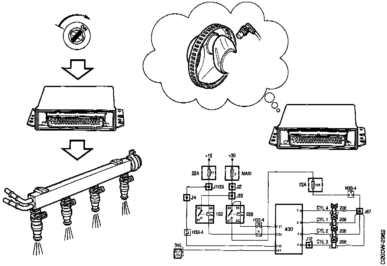 When the ignition is switched ON, the ECM is activated and pre-injection takes place provided certain conditions are met. The ECM then waits for pulses from the crankshaft position sensor.