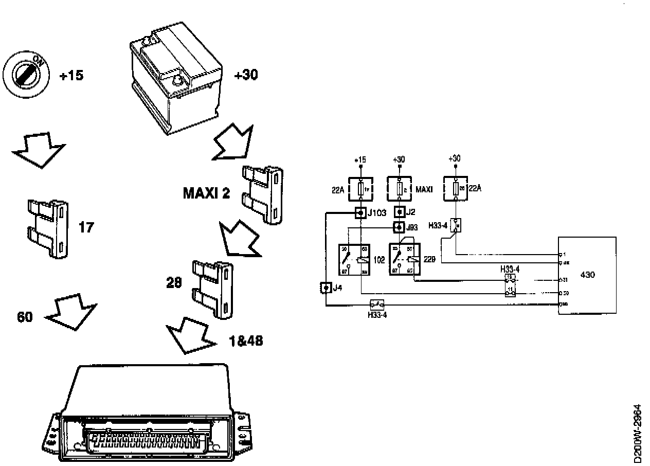 +30 voltage is supplied from maxi fuse 2 to the main relay, fuel pump relay and fuse 28. From fuse 28 voltage is supplied to ECM pins 1 and 48.