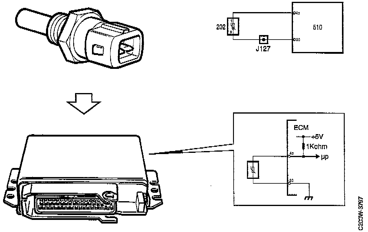 The control module measures the coolant temperature by supplying the sensor with 5 V from pin 45 via an integral 1 kOhm resistor. The sensor is grounded via pin 30 of the control module.
