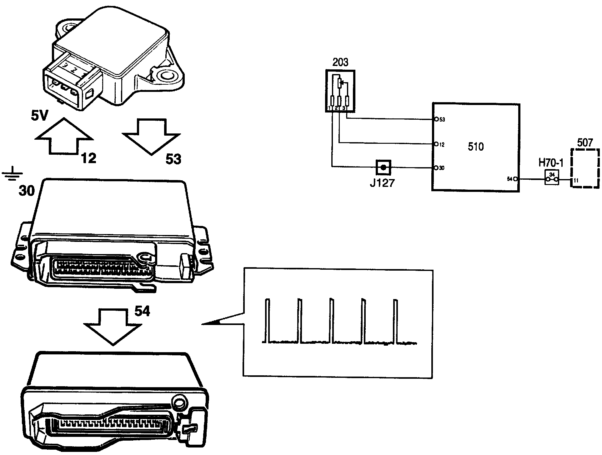 The sensor is supplied with a 5 V from pin 12 and grounded via pin 30 of the control module. The voltage from the sensor is connected to pin 53 of the control module and is proportional to the throttle opening.