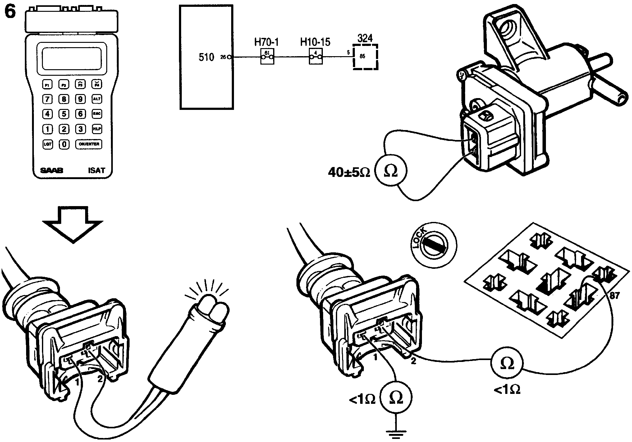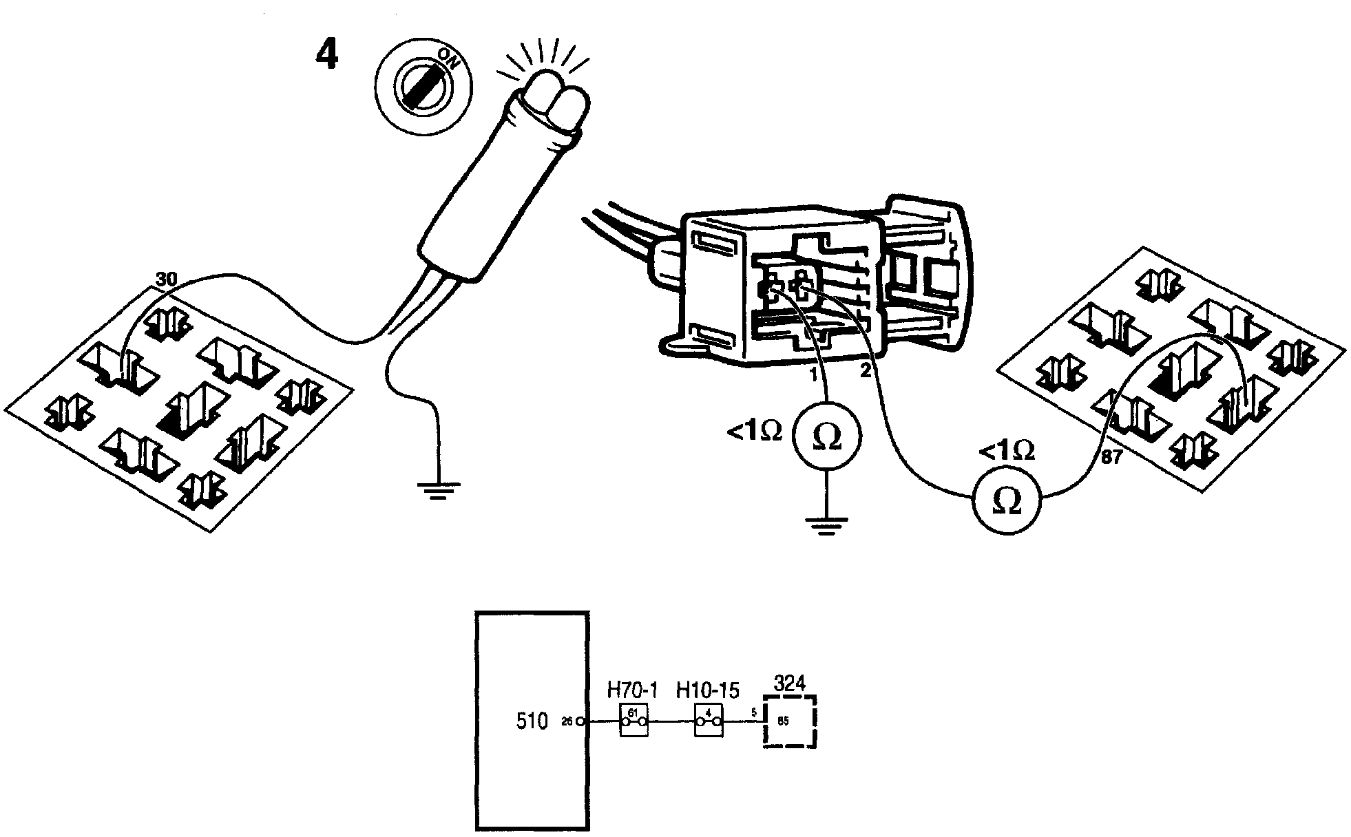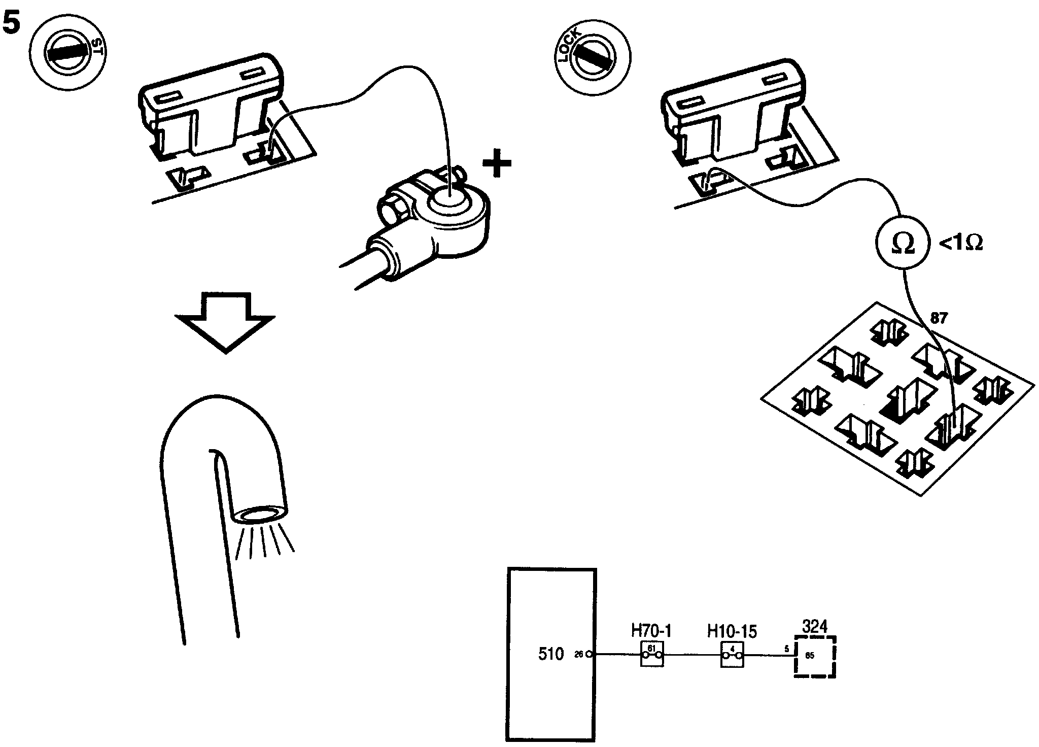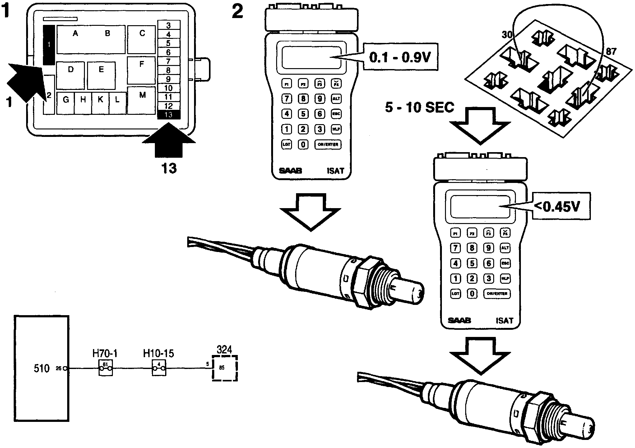 Select "REAR OXYGEN SENSOR". When Lambda control does not work, i.e. the Scan Tool display oscillates between 0.1 V and 0.9 V, connect a jumper lead across pins 30 and 87 of the relay base for 5-10 seconds. The oxygen sensor voltage does not oscillate and remains steady at 0.45 V.