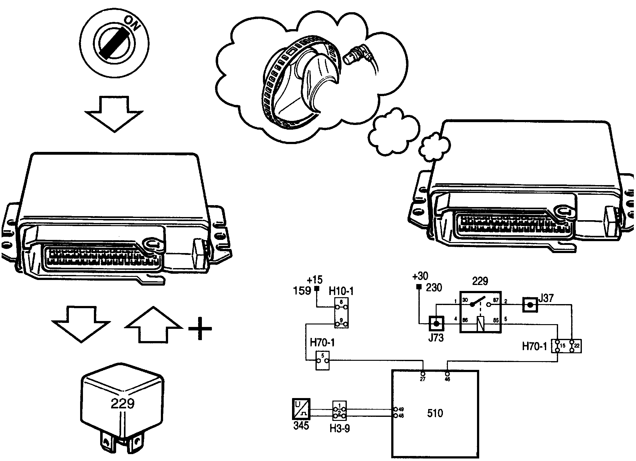 When +15 is applied to pin 27 the control module is activated, grounding pin 46 and causing the main relay to operate. The main relay supplies the control module with positive battery voltage on pin 37.