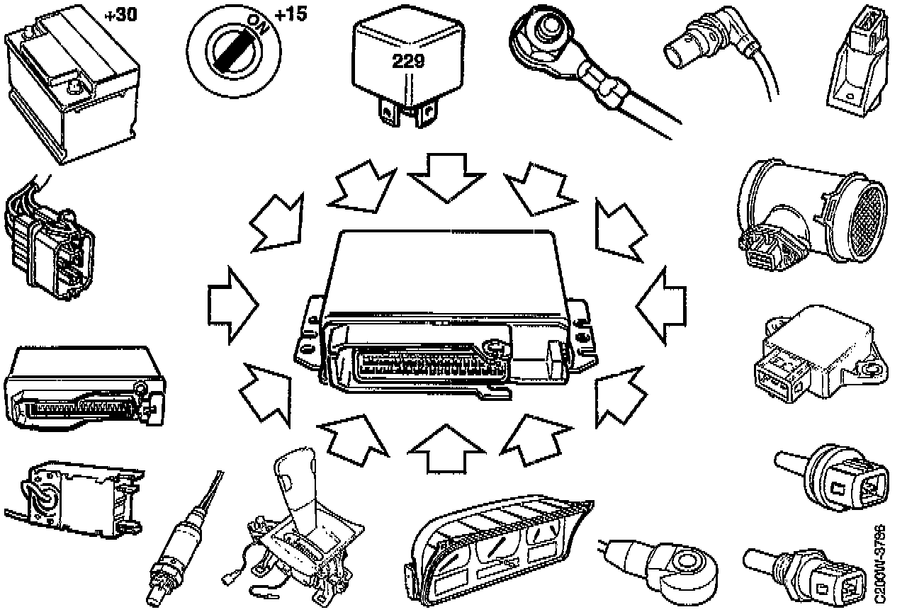 The principal measured quantity for fuel injection comes from the mass air flow sensor. Substitute functions are provided for all sensors except the crankshaft position sensor.