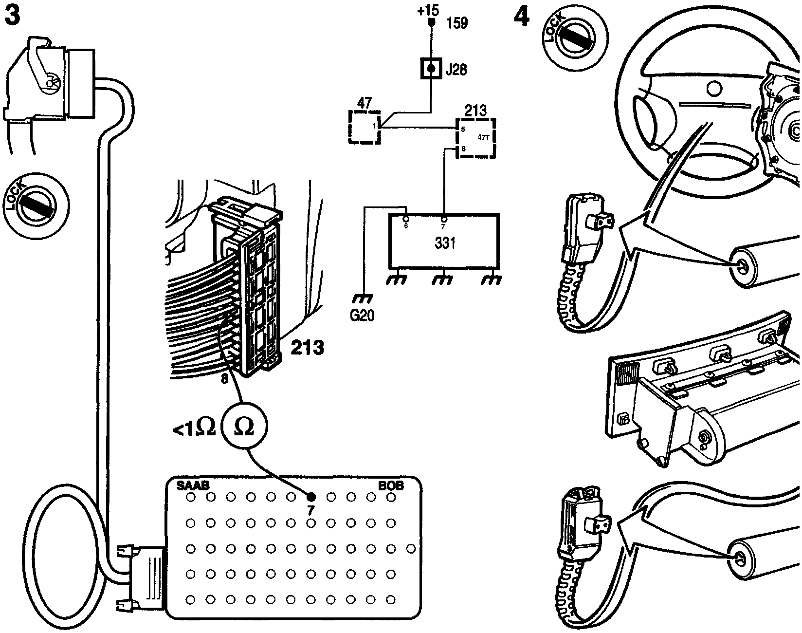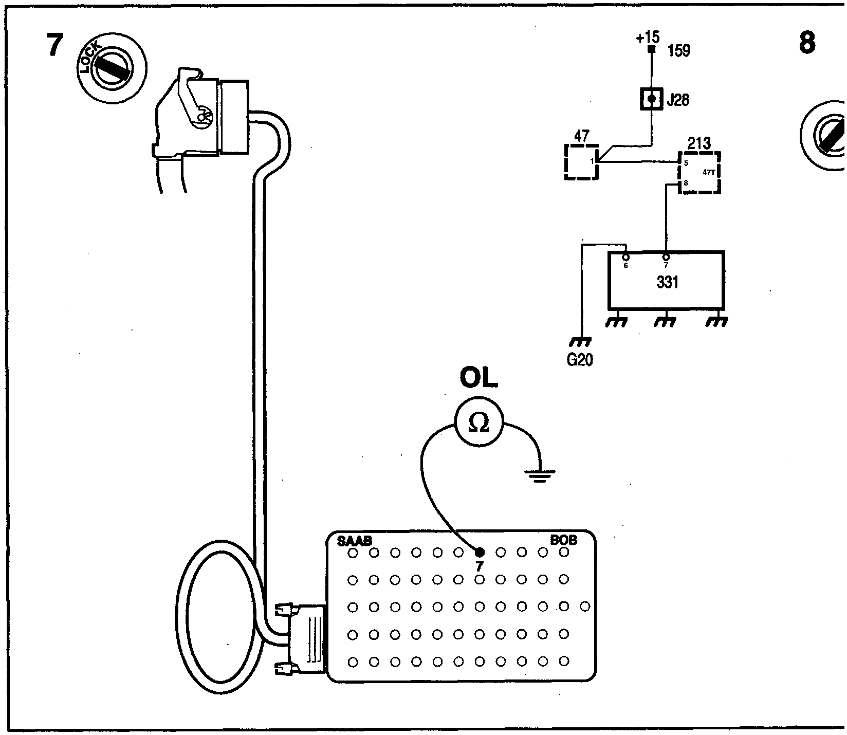 7. Take out the combined instrument. Unplug the pictogram connector in the combined instrument. Connect an ohmmeter between contact 7 on the BOB and a safe grounding point.