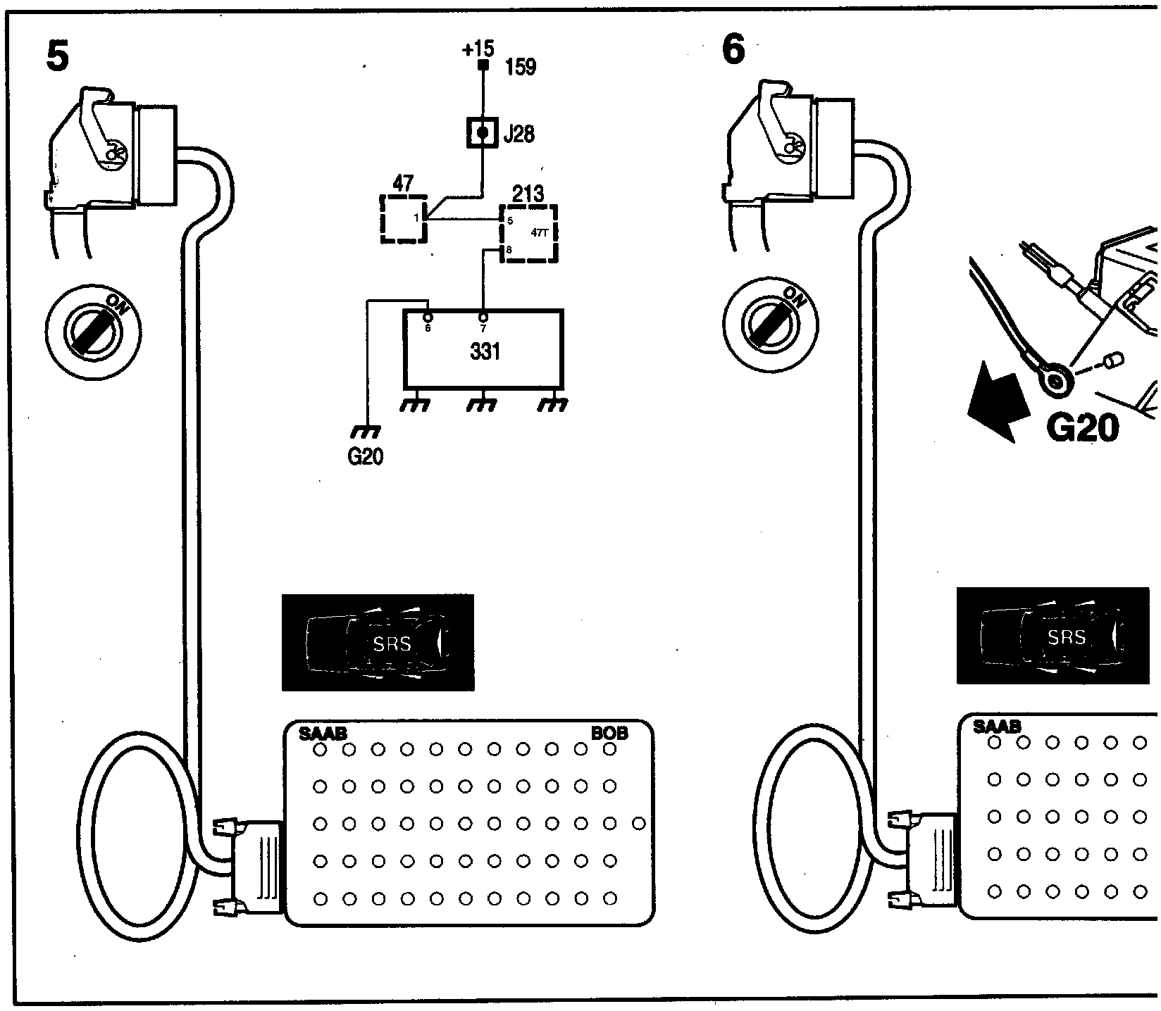 5. Free the SRS control module. Unplug the connector from the SRS control module and plug a BOB into the connector. Refit the battery negative lead and switch on the ignition.
