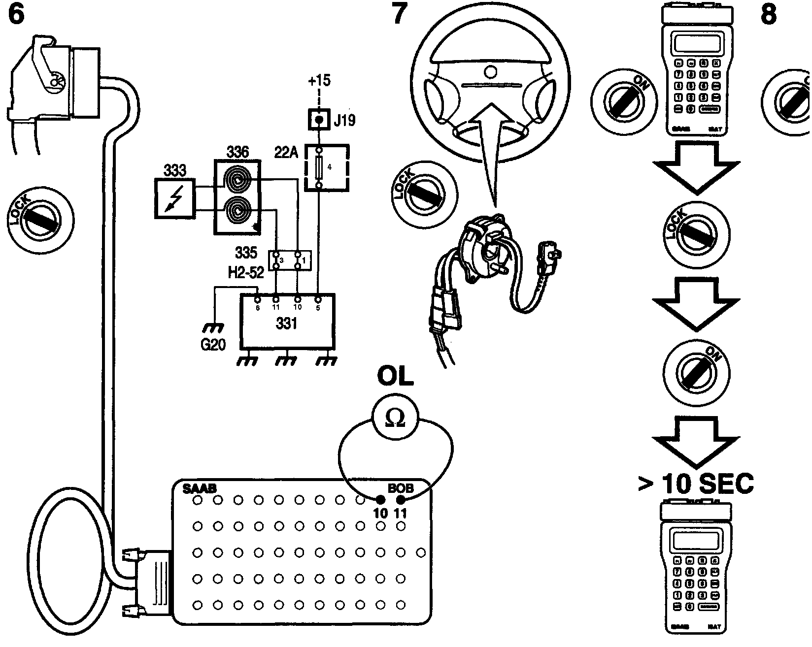 6. Switch off the ignition. Unplug the connector from the SRS control module and connect a BOB. Unplug connector H2-52. Connect an ohmmeter between contacts 10 and 11 on the BOB.