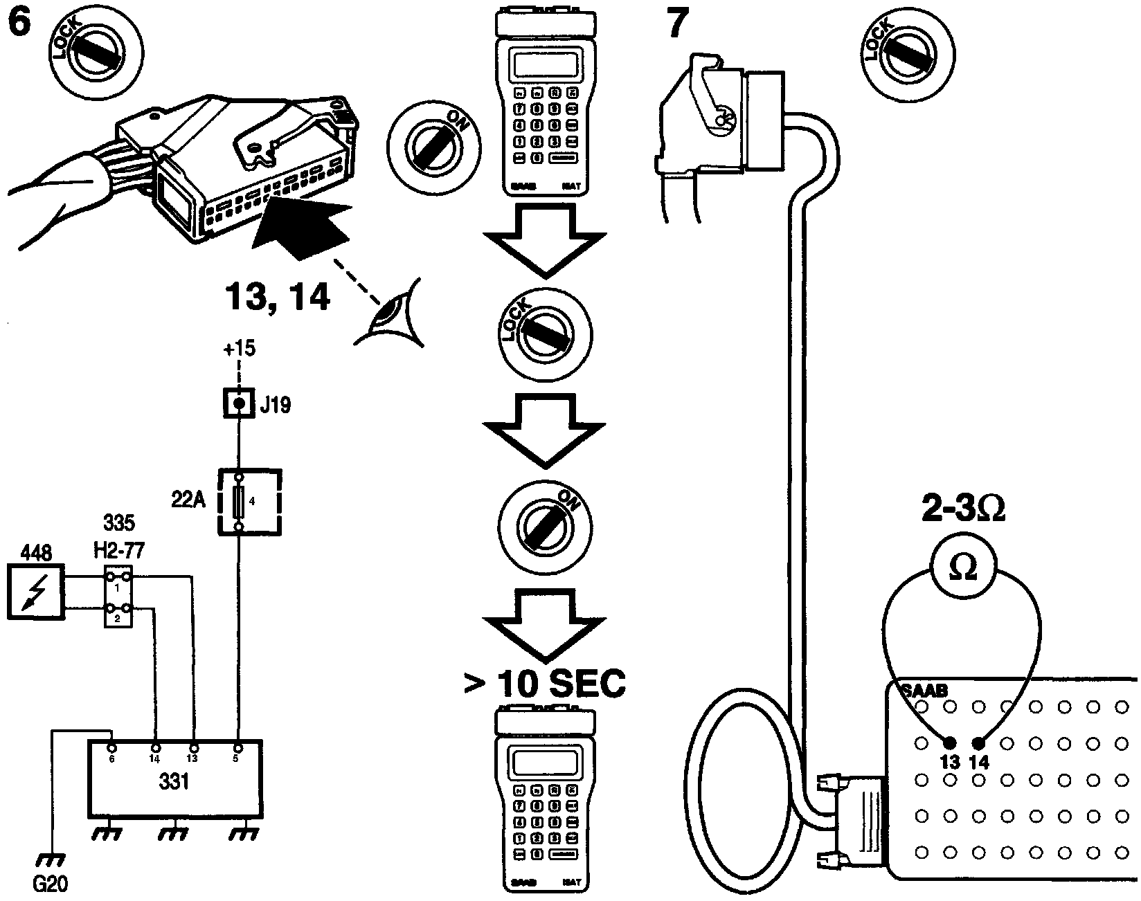 7. Switch off the ignition. Remove the connector from the SRS control module and plug a BOB into the connector. Connect an ohmmeter between contacts 13 and 14 on the BOB. The ohmmeter should read 2-3 ohms.